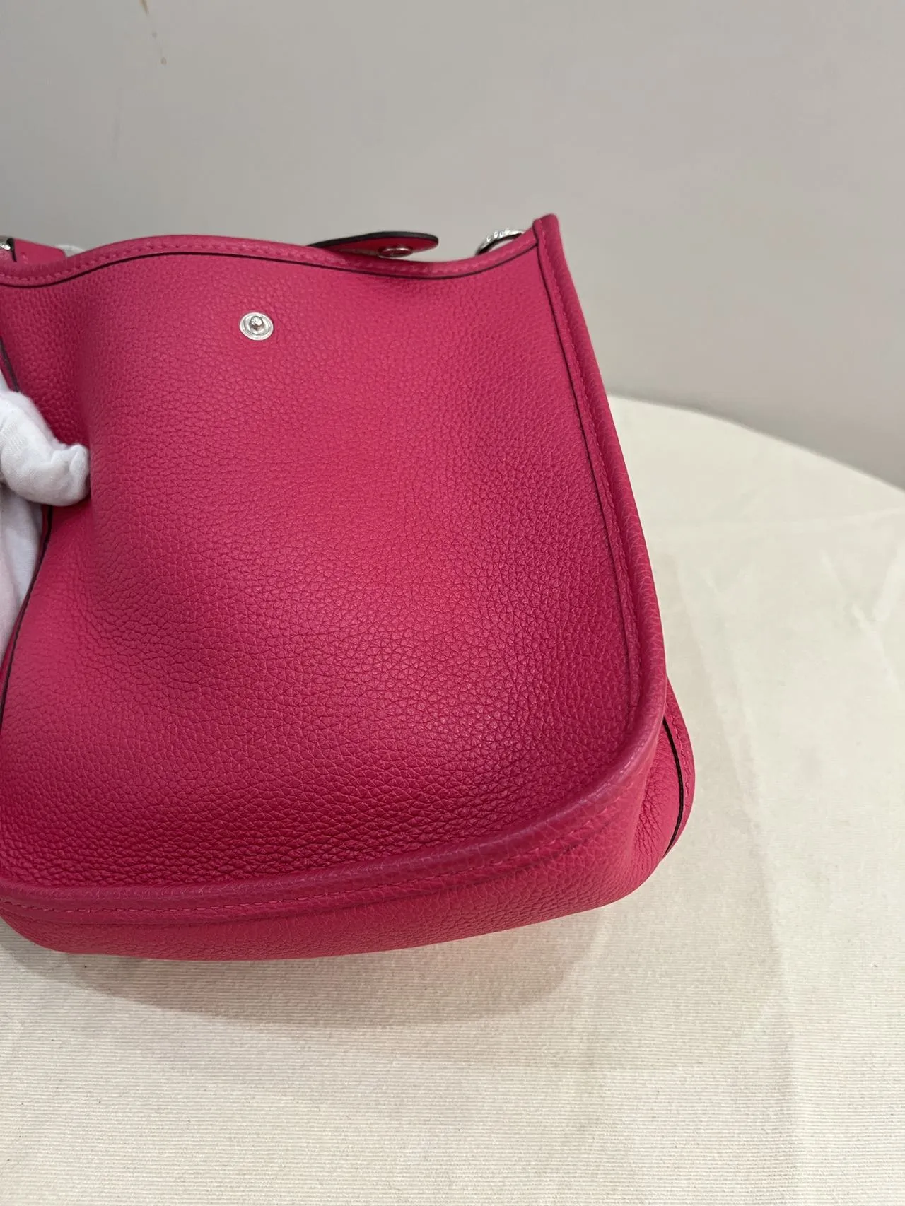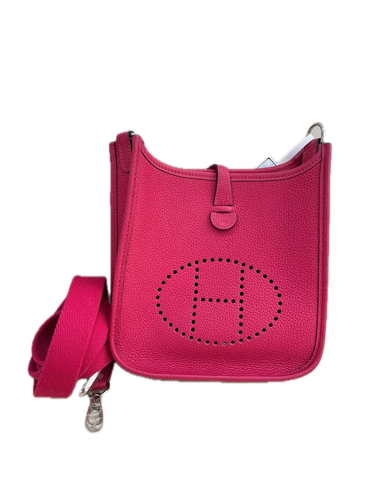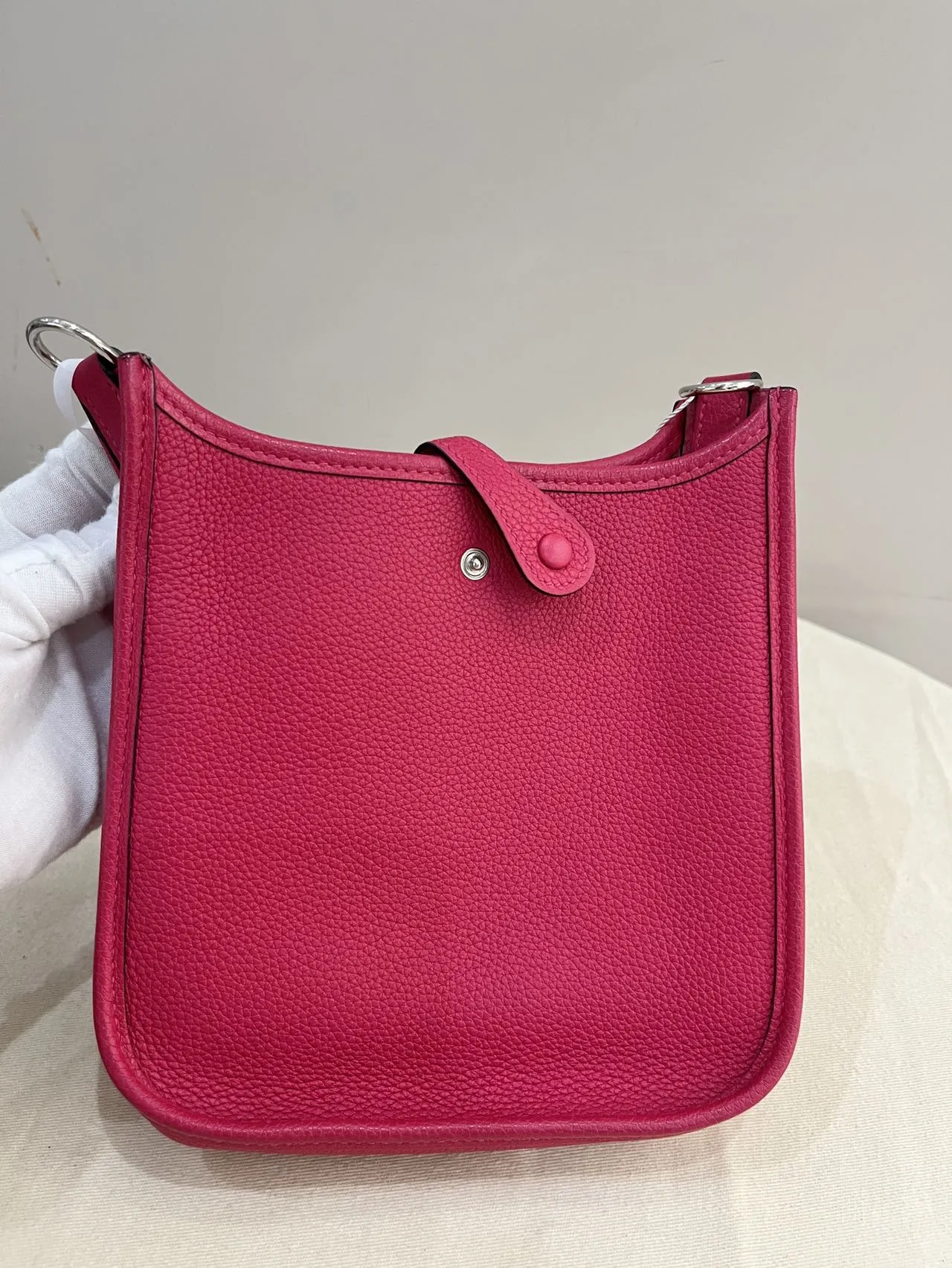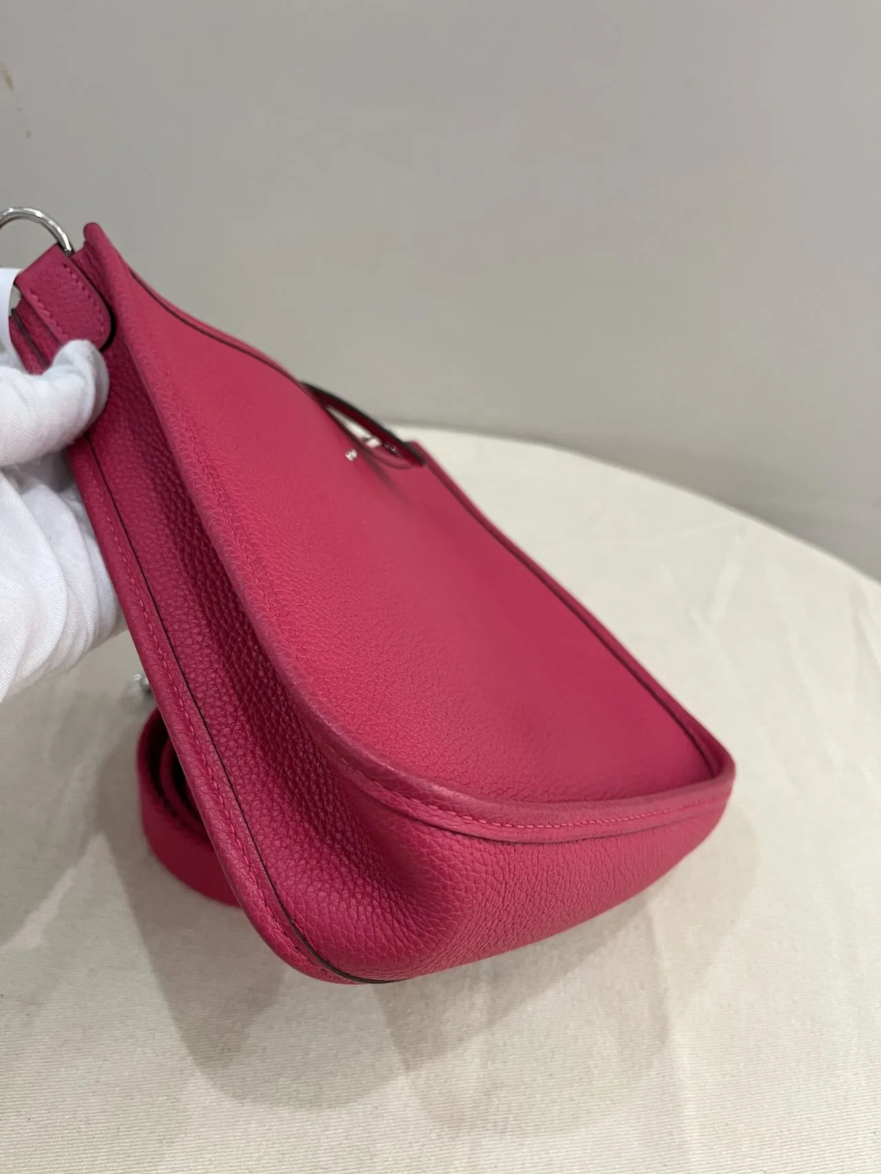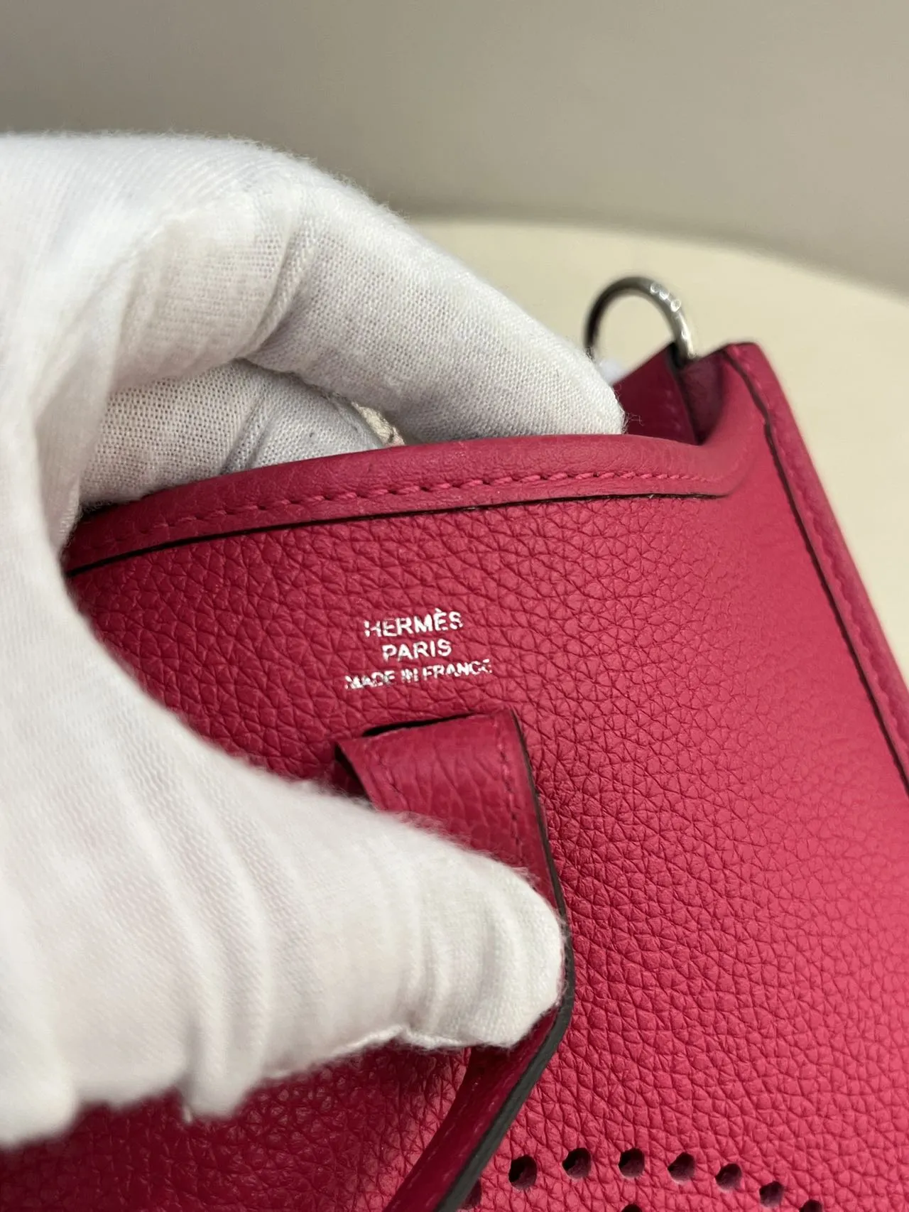 The Hermès Evelyne TPM 16 in Rose Pink Clemence leather with palladium hardware is a timeless casual-chic crossbody bag. Featuring the iconic perforated “H” logo and an adjustable canvas strap, it offers effortless elegance and everyday practicality.