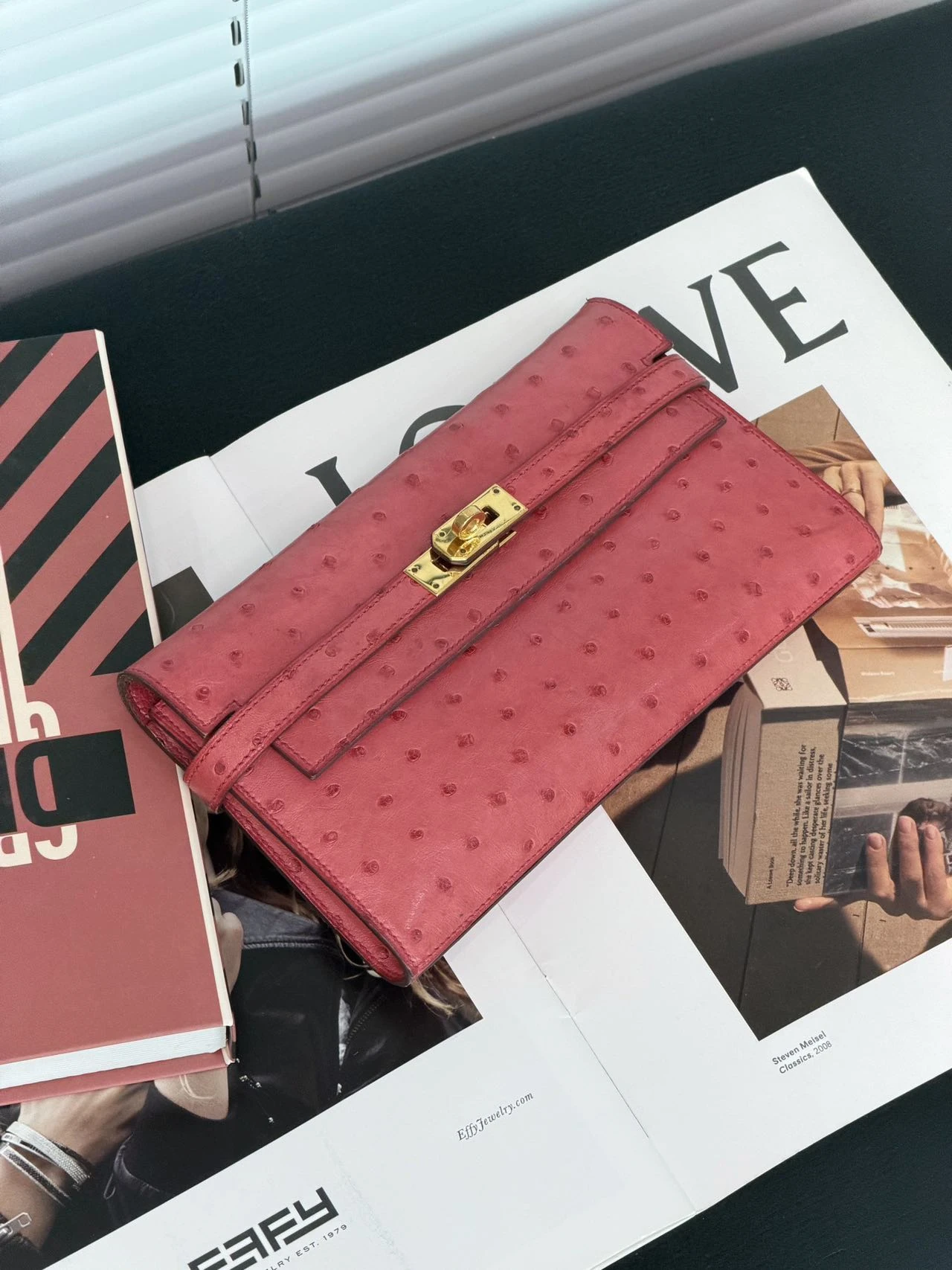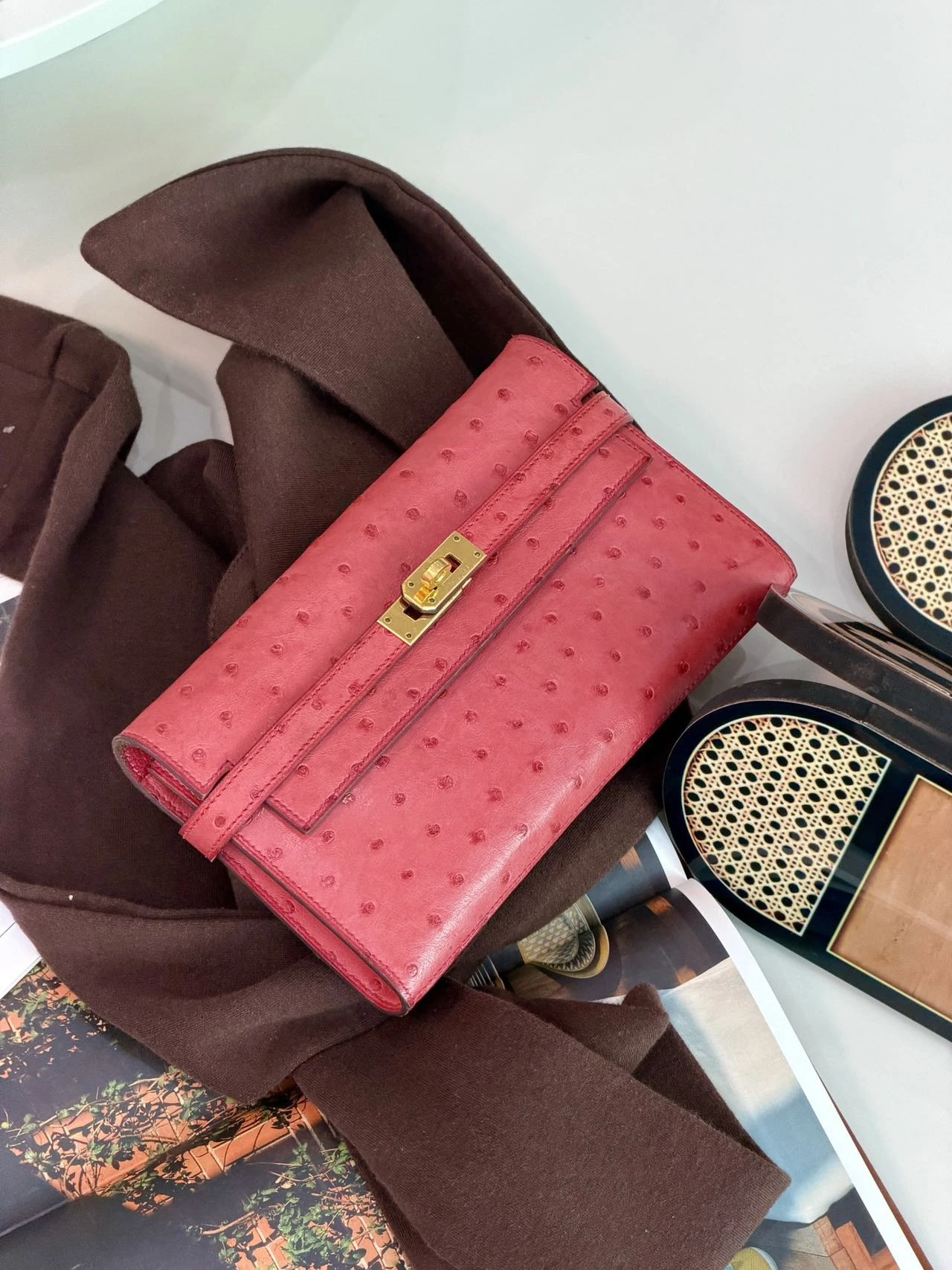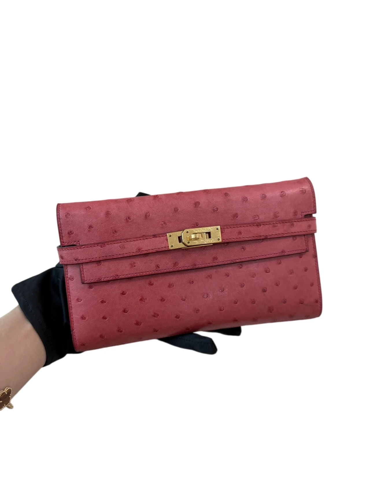 HERMES Kelly Long Wallet Rouge Pink Ostrich Leather Gold Hardware is crafted from luxurious ostrich leather in a vibrant and feminine tone, showcasing Hermès’ iconic craftsmanship.