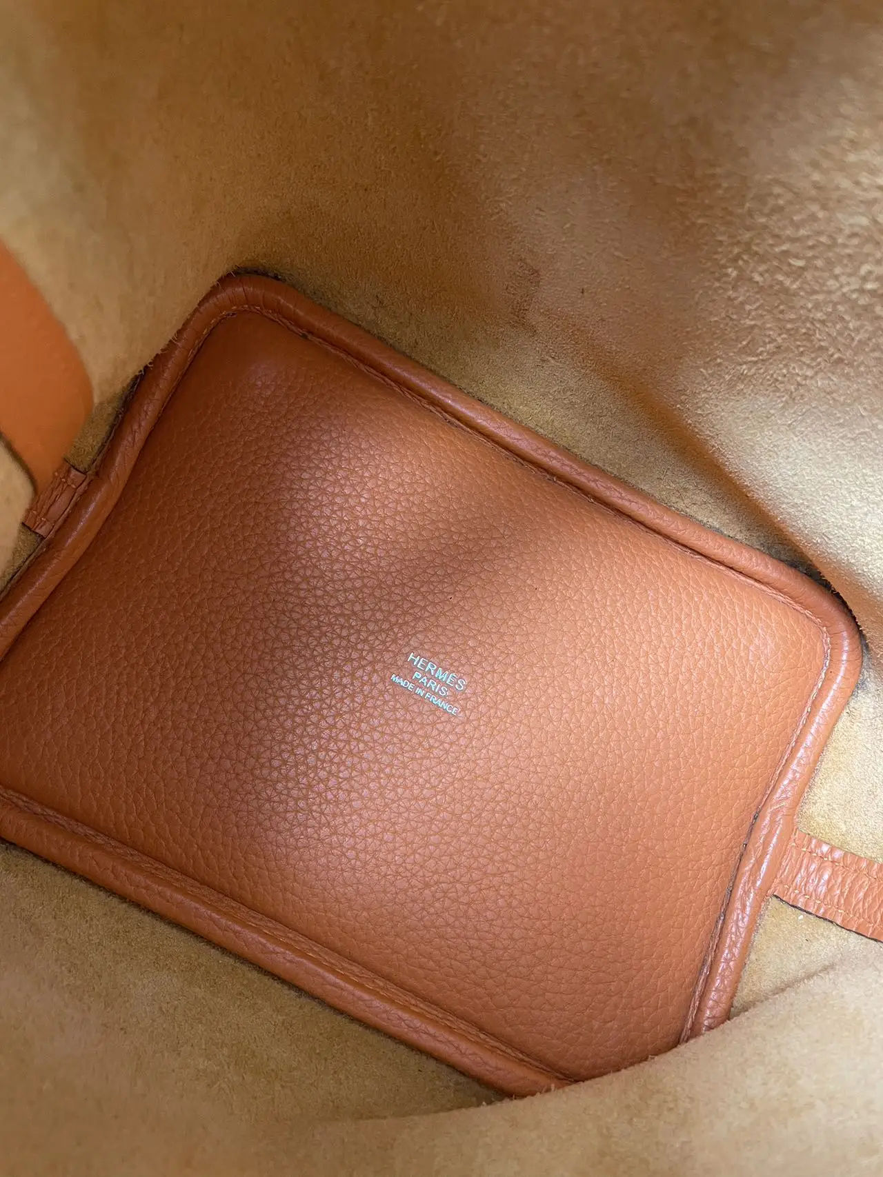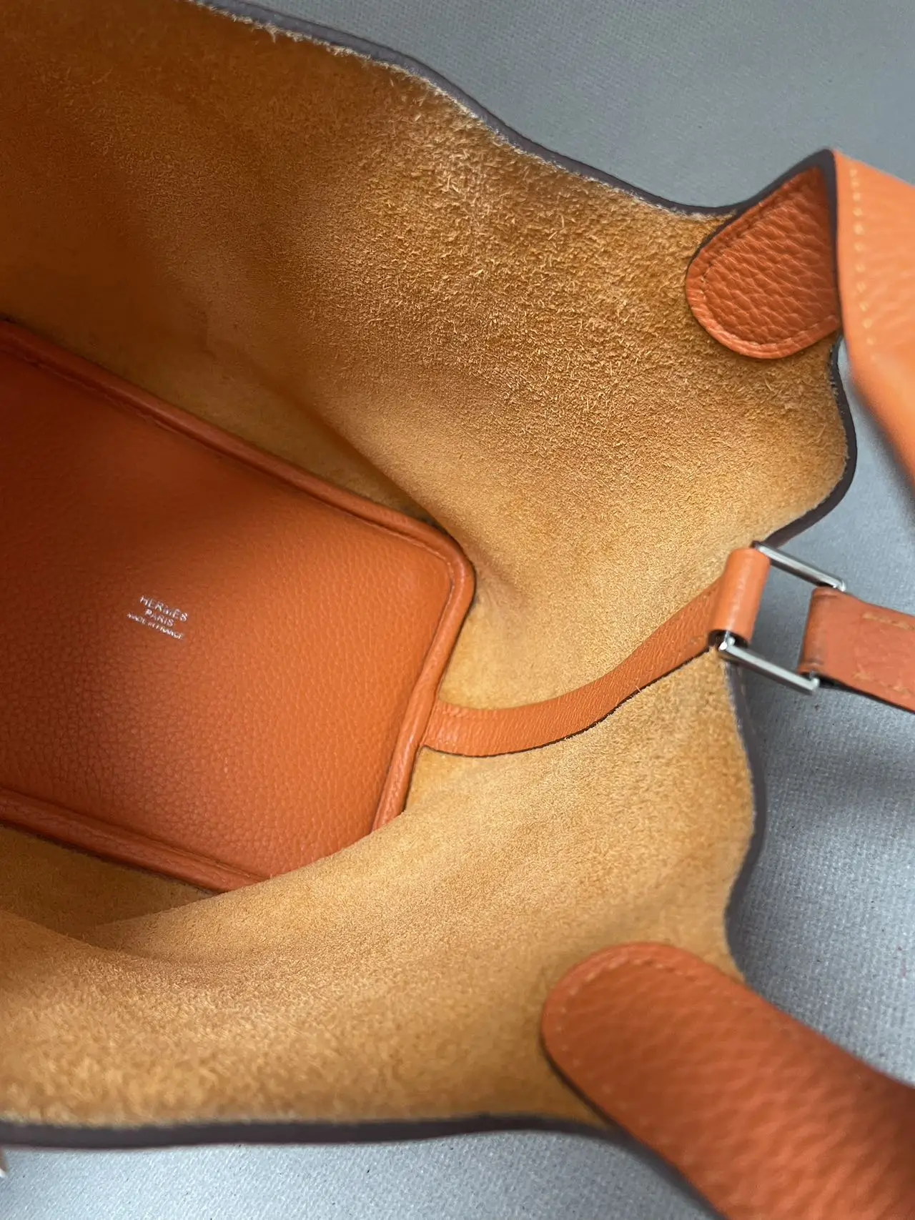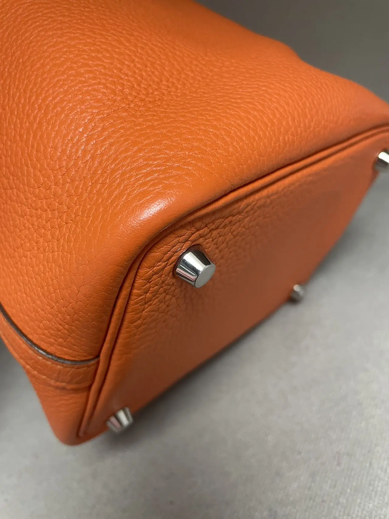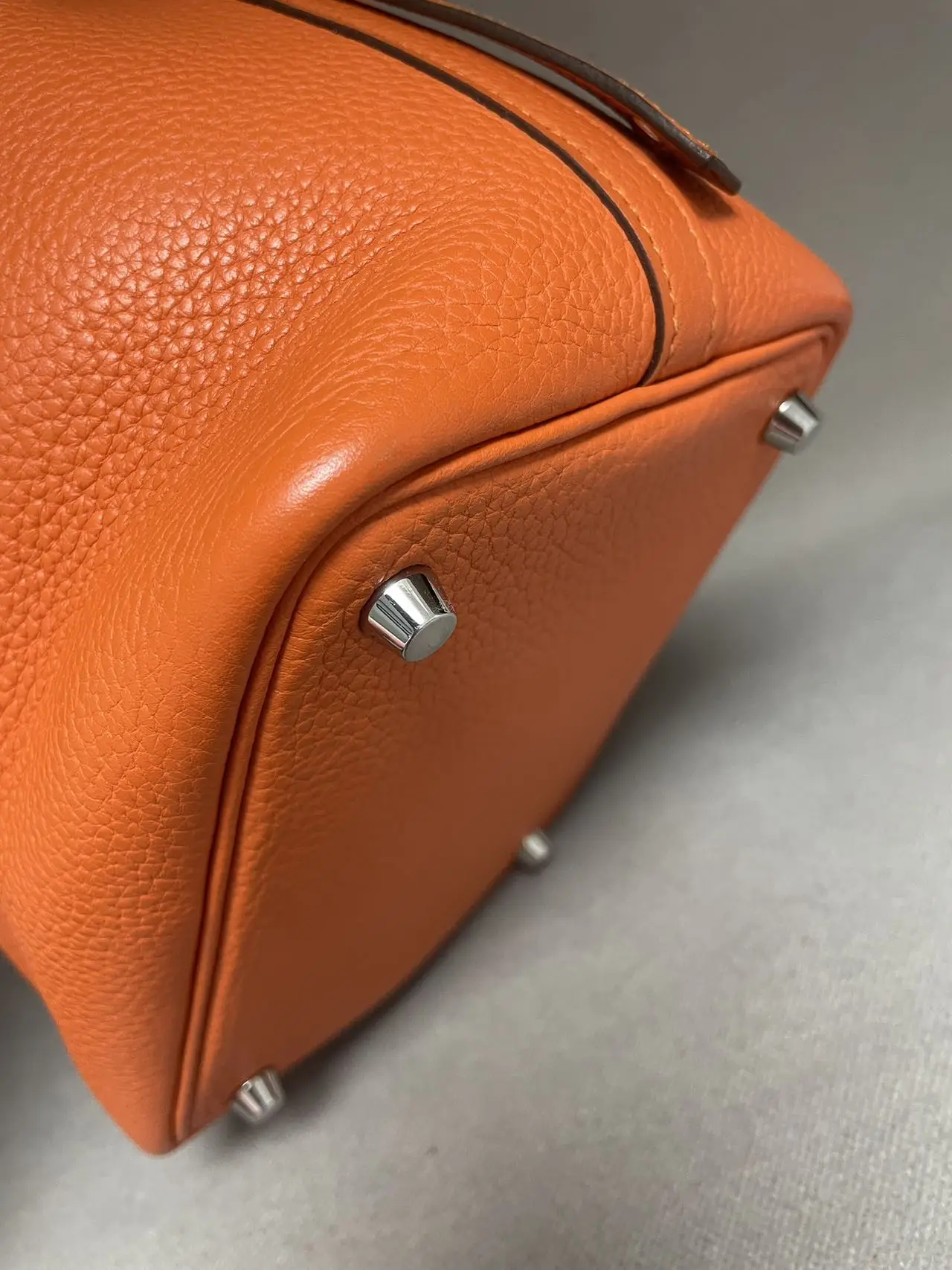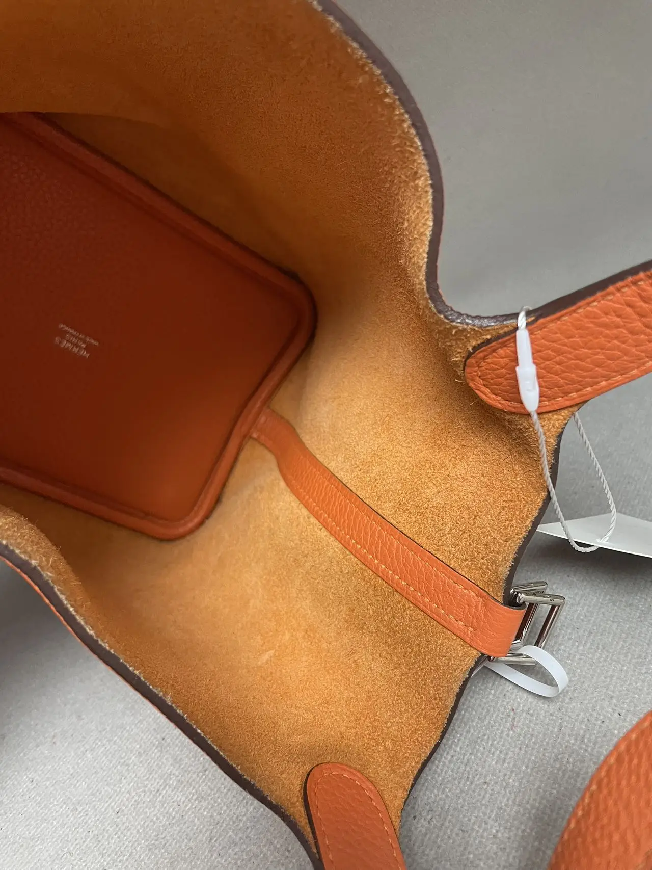 The HERMÈS Picotin Lock 18 in vibrant orange Clemence leather with palladium hardware is the quintessential icon of casual luxury, instantly recognizable by its supple bucket silhouette and relaxed leather drawstring closure, complete with its full set of lock and keys for an effortlessly chic statement.