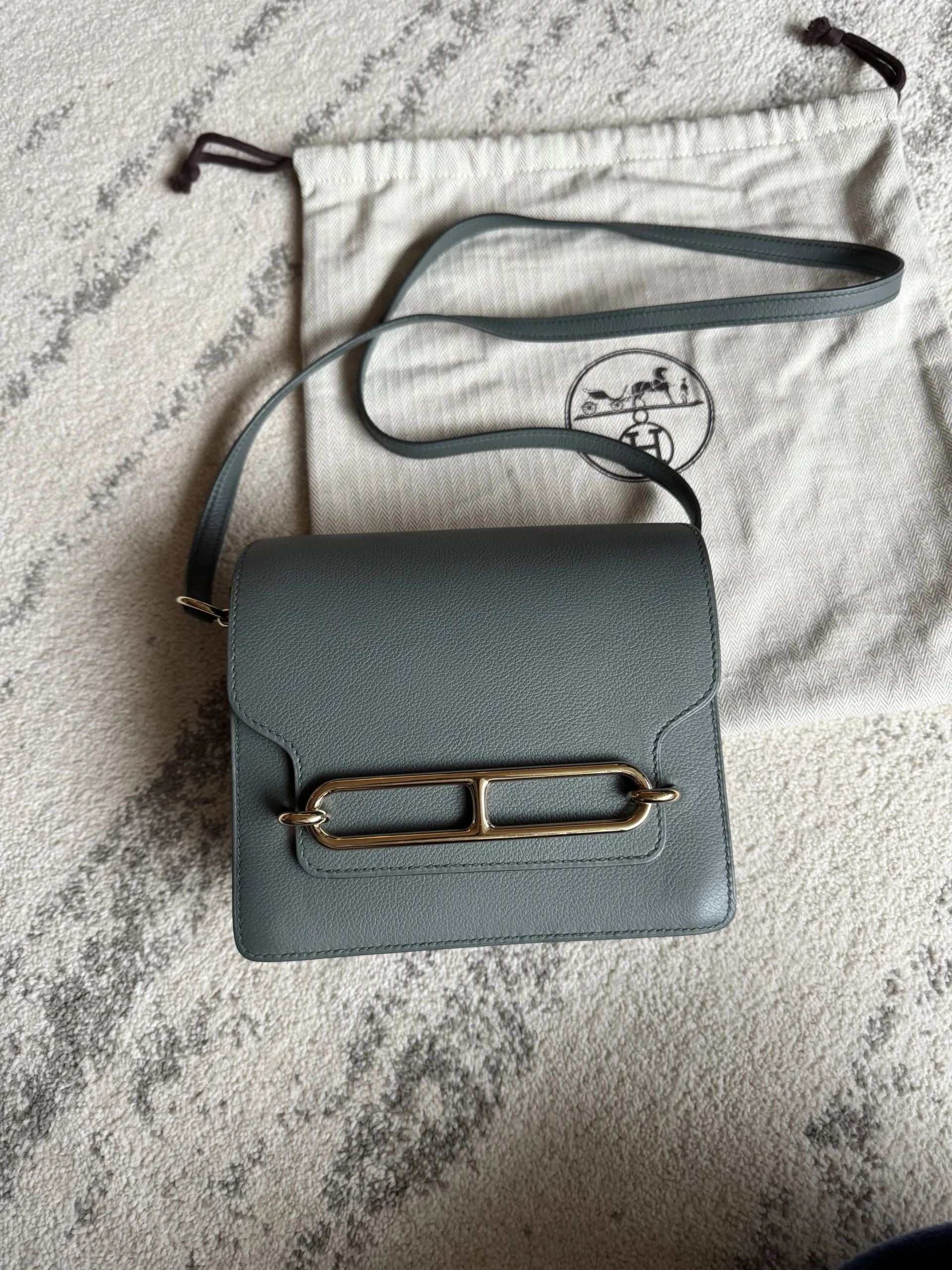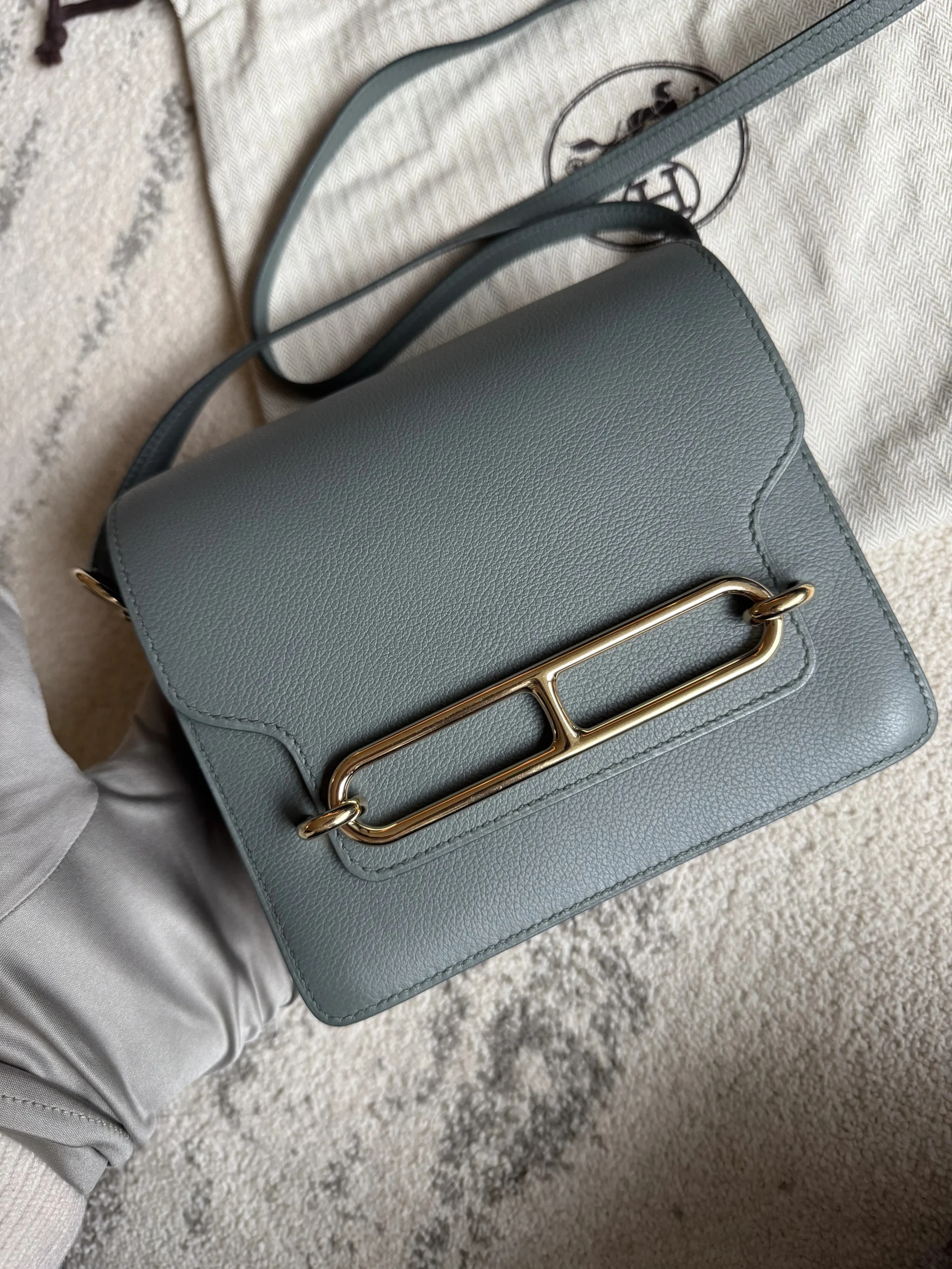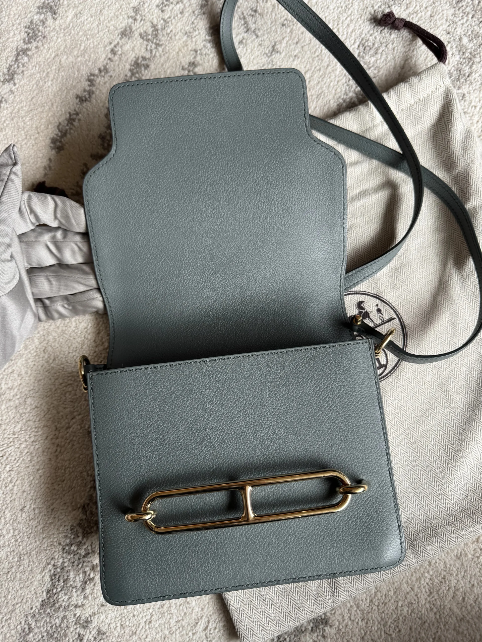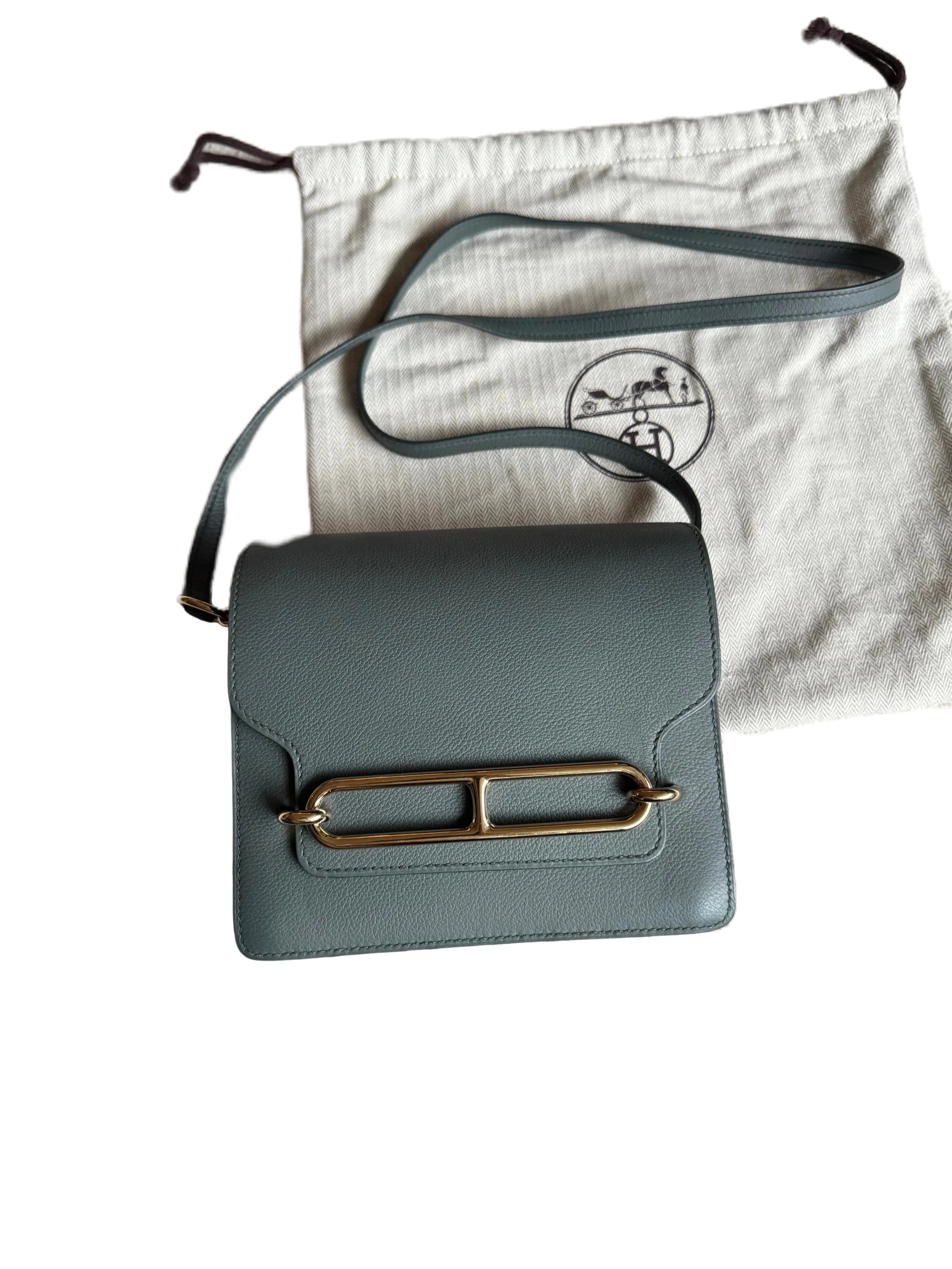 HERMÈS Roulis Mini 18 Grey/Green Calfskin Bag crafted from supple Evercolor calfskin with a refined satiny finish, this Hermès Roulis Mini offers a soft yet structured silhouette. Featuring an adjustable strap for shoulder or crossbody wear, it blends everyday practicality with timeless elegance.