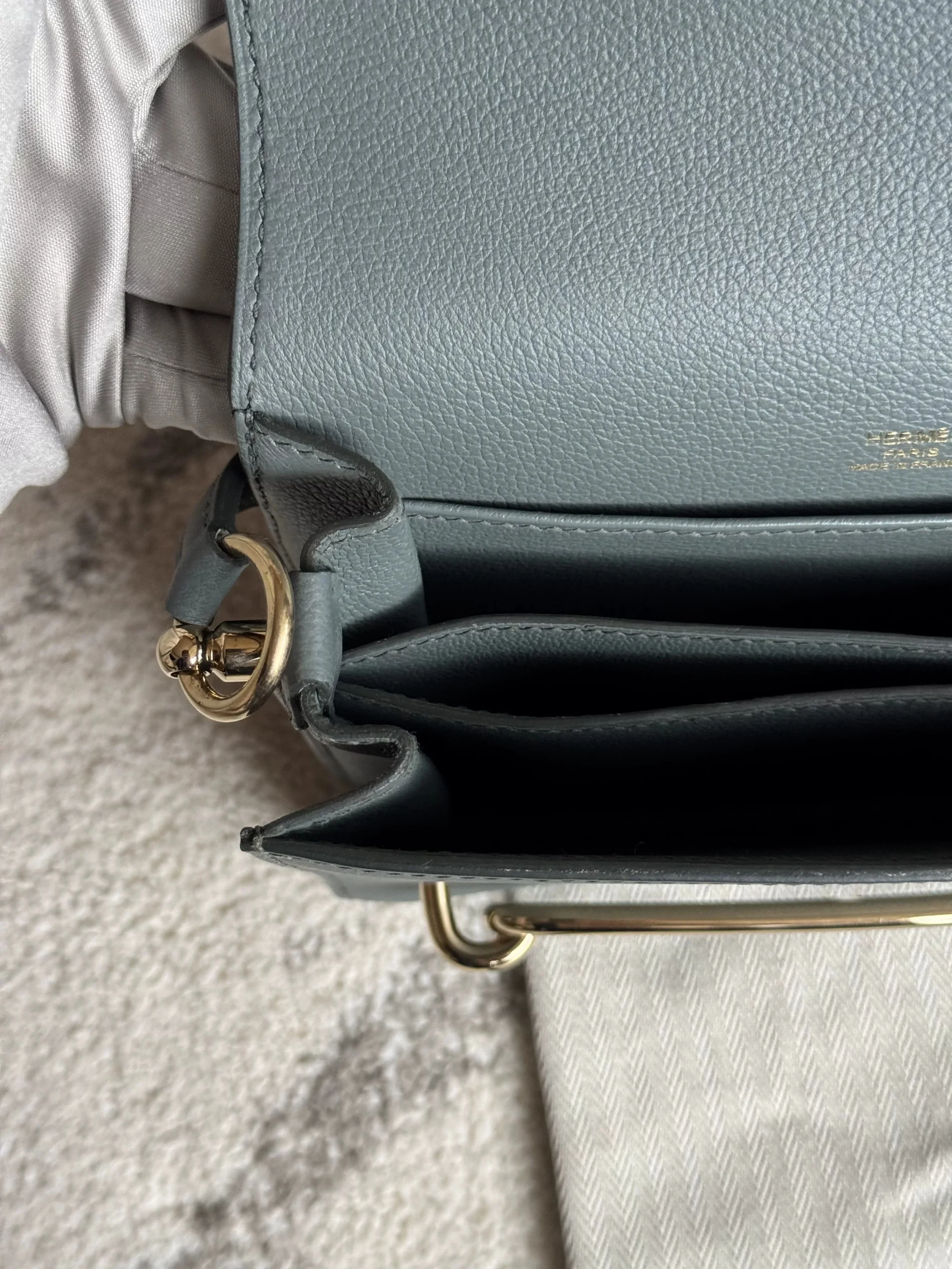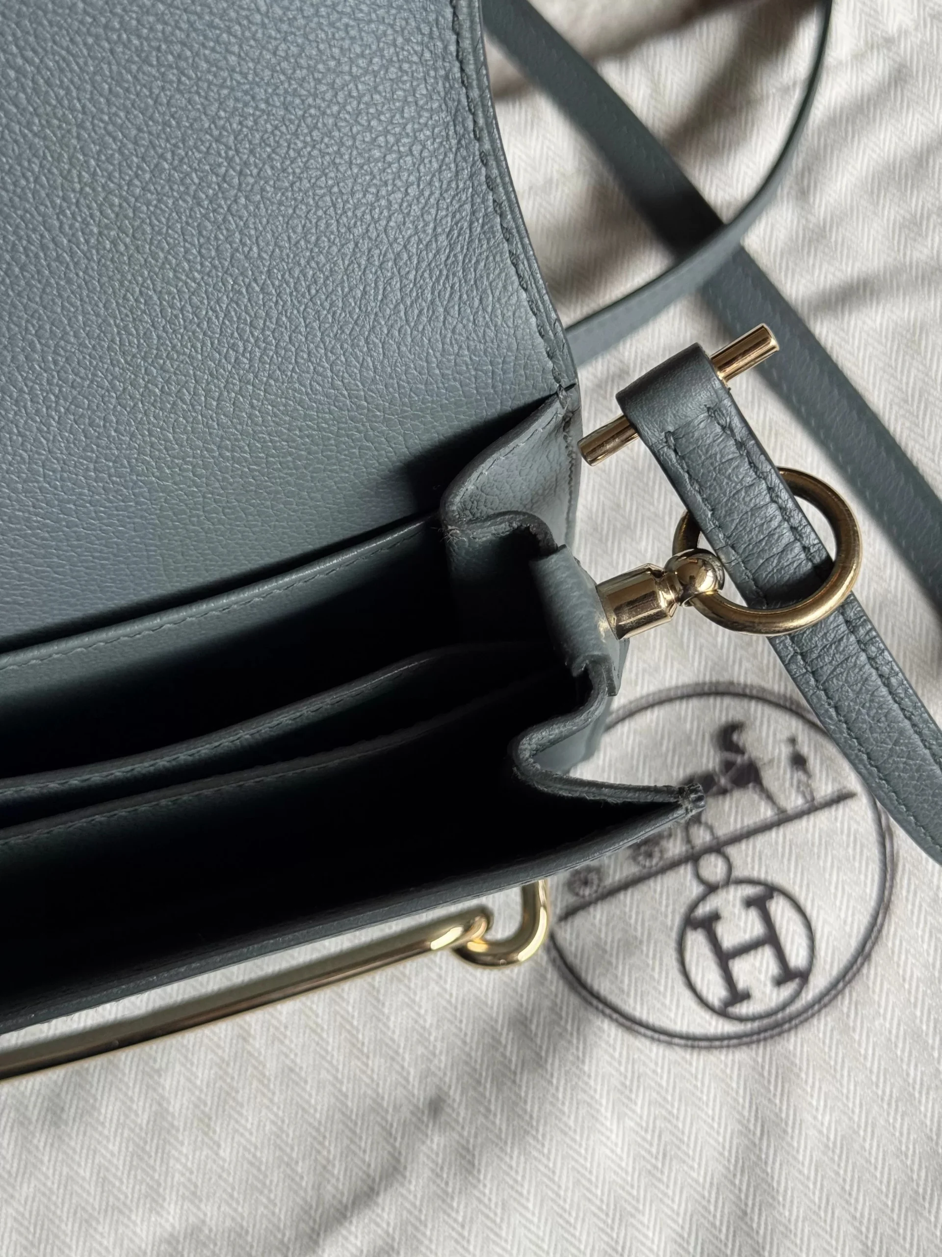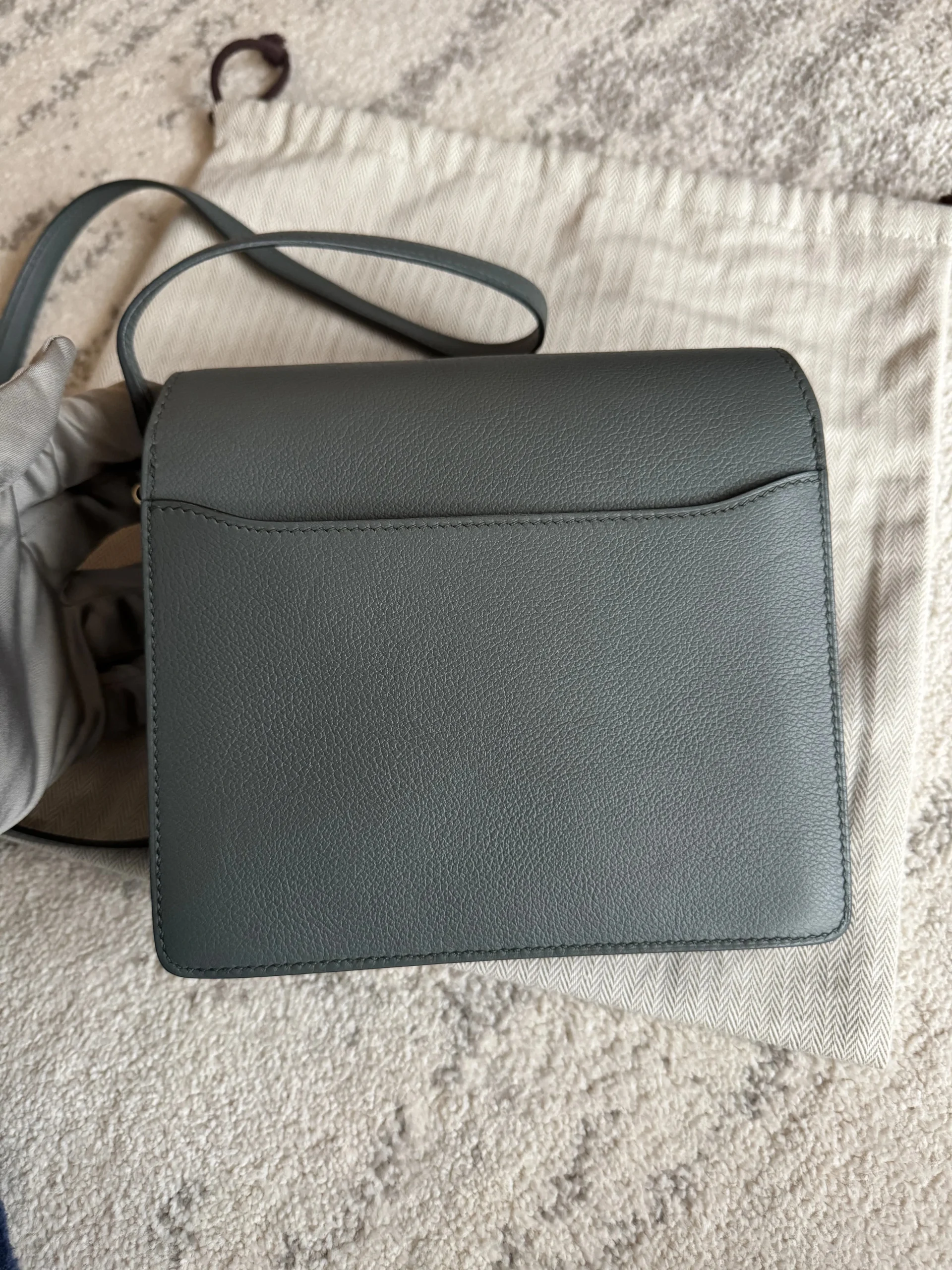 HERMÈS Roulis Mini 18 Grey/Green Calfskin Bag crafted from supple Evercolor calfskin with a refined satiny finish, this Hermès Roulis Mini offers a soft yet structured silhouette. Featuring an adjustable strap for shoulder or crossbody wear, it blends everyday practicality with timeless elegance.