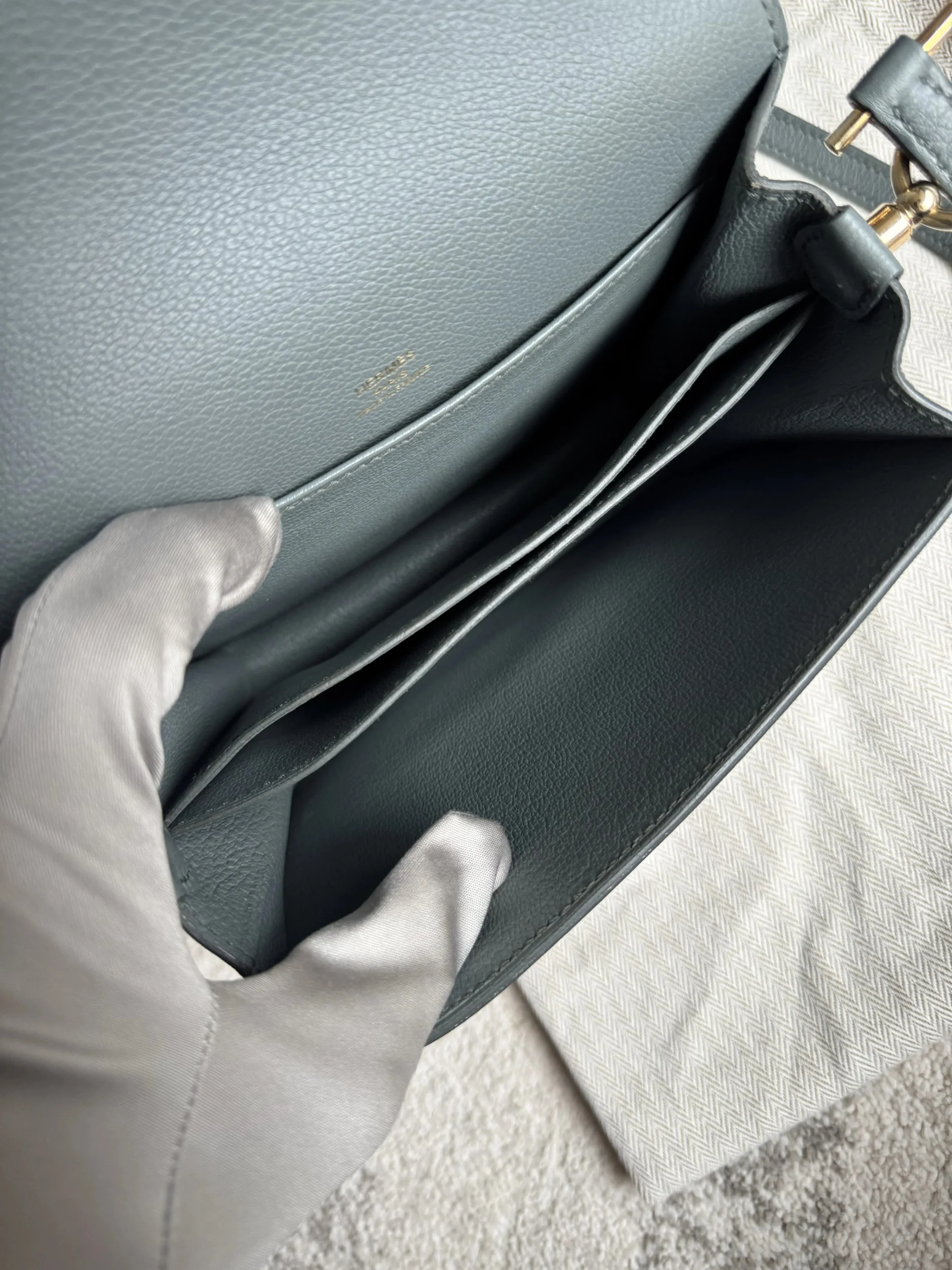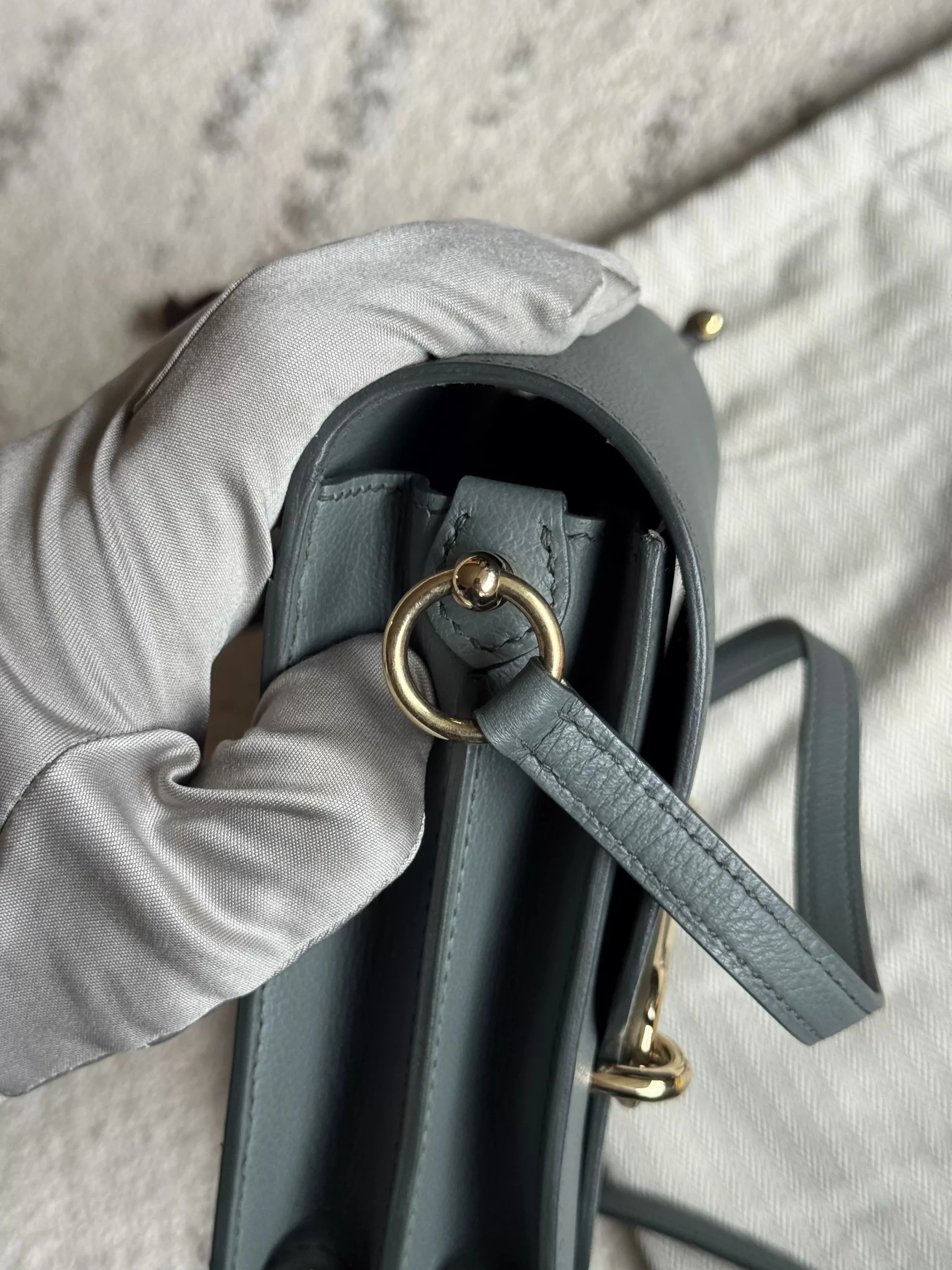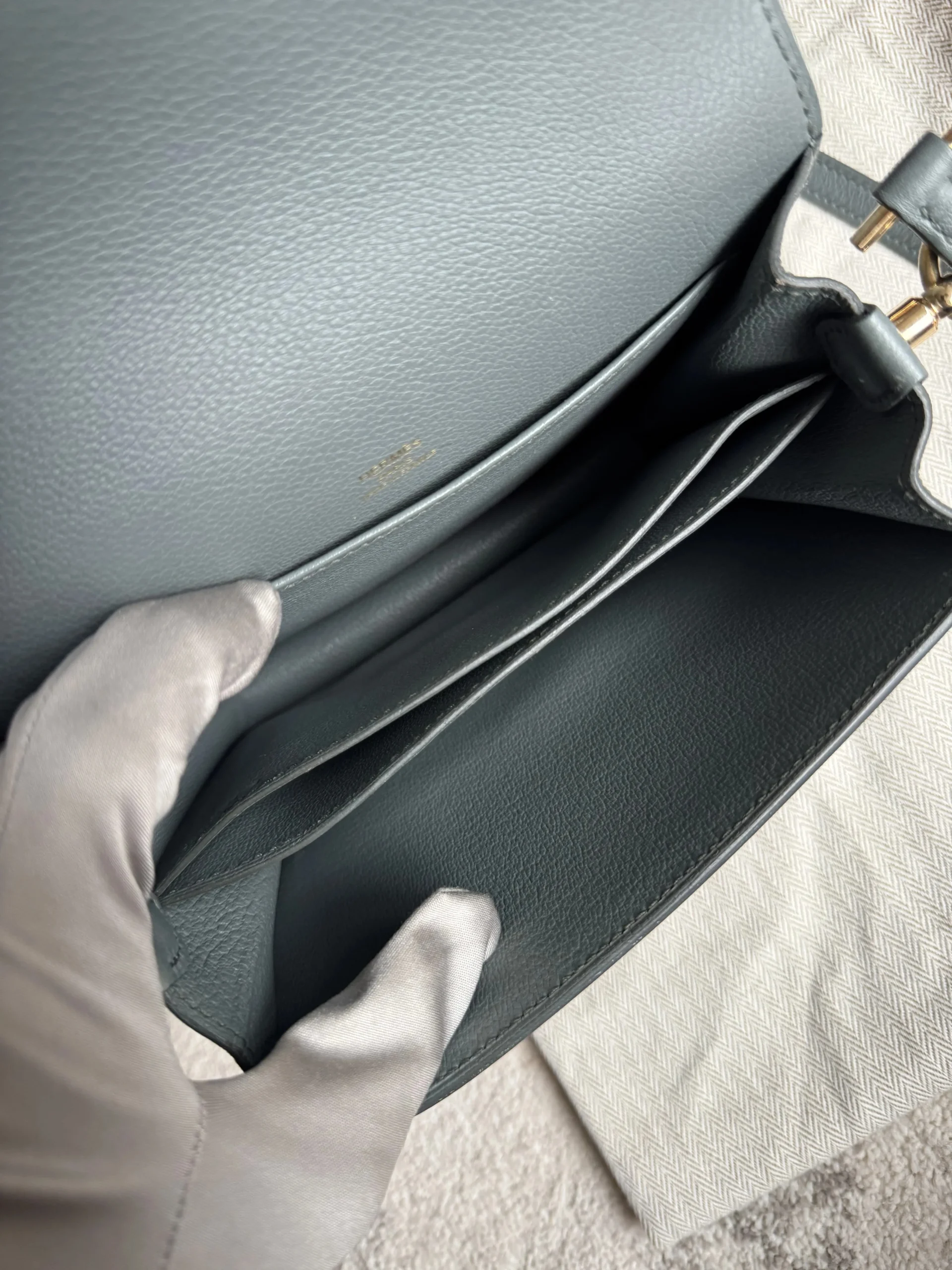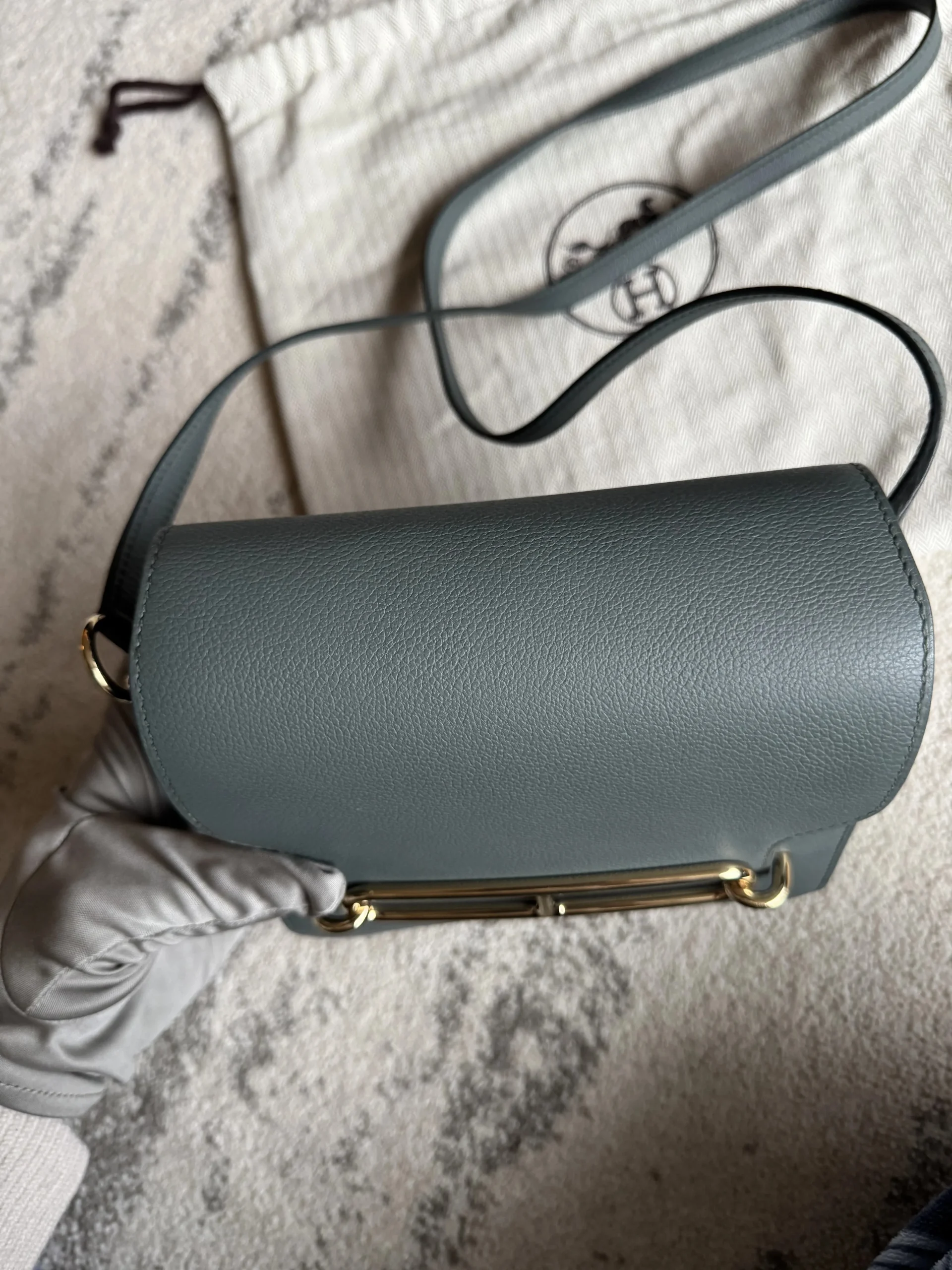 HERMÈS Roulis Mini 18 Grey/Green Calfskin Bag crafted from supple Evercolor calfskin with a refined satiny finish, this Hermès Roulis Mini offers a soft yet structured silhouette. Featuring an adjustable strap for shoulder or crossbody wear, it blends everyday practicality with timeless elegance.