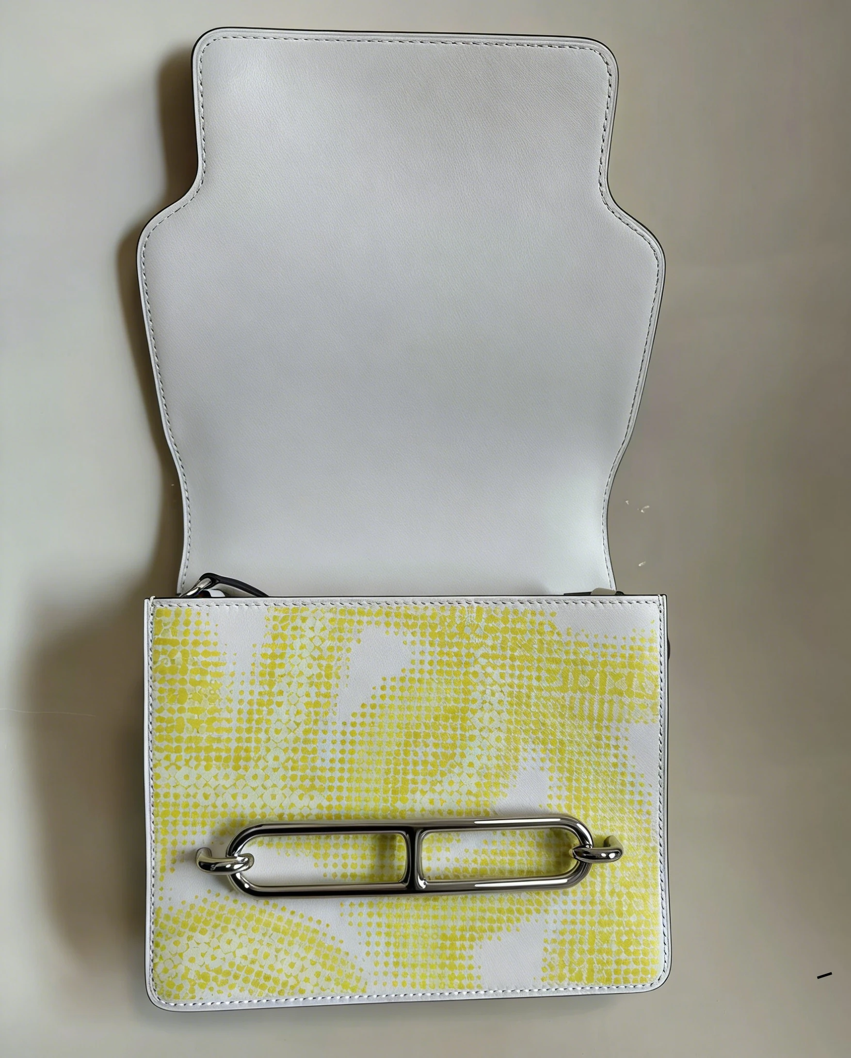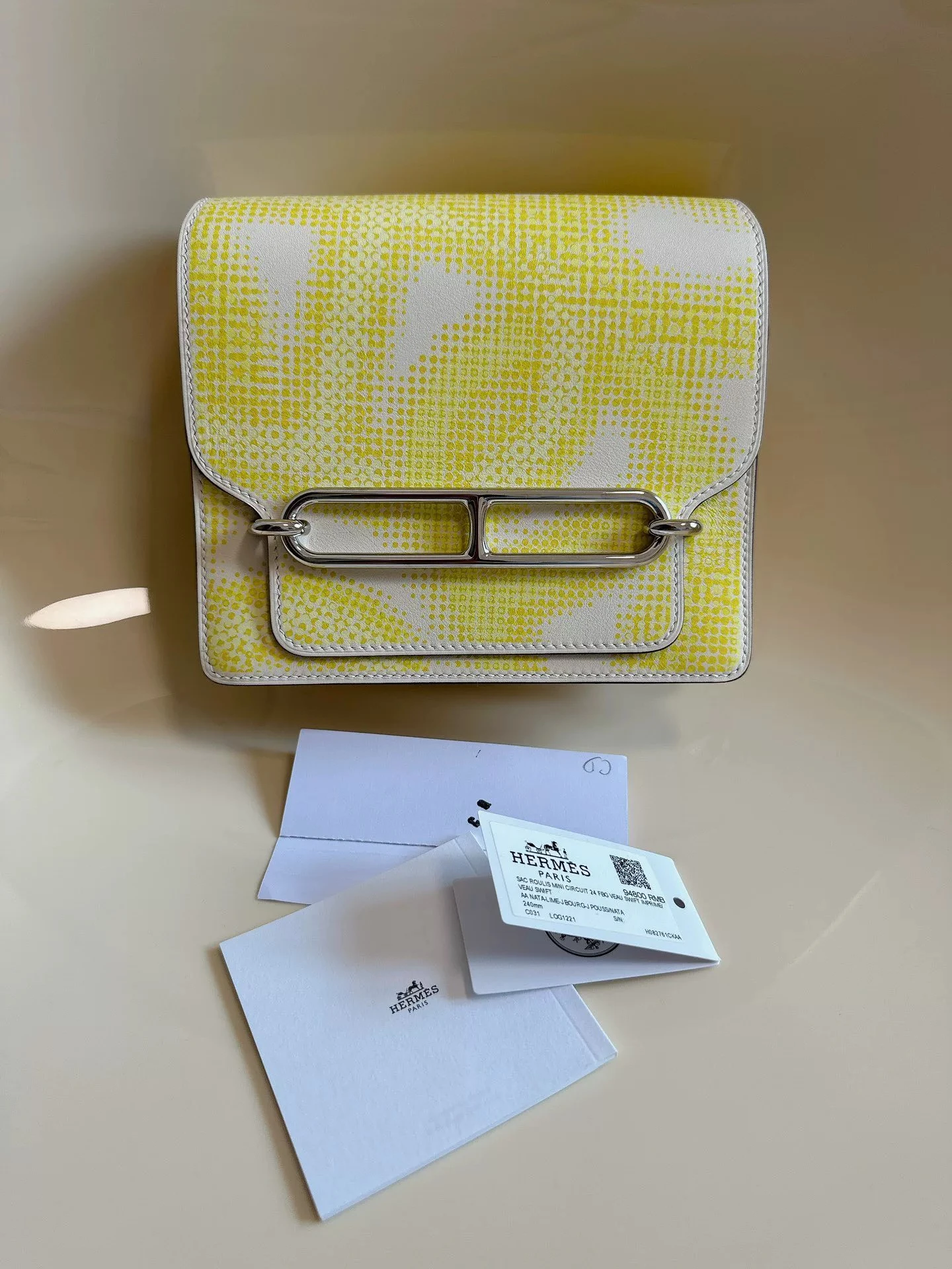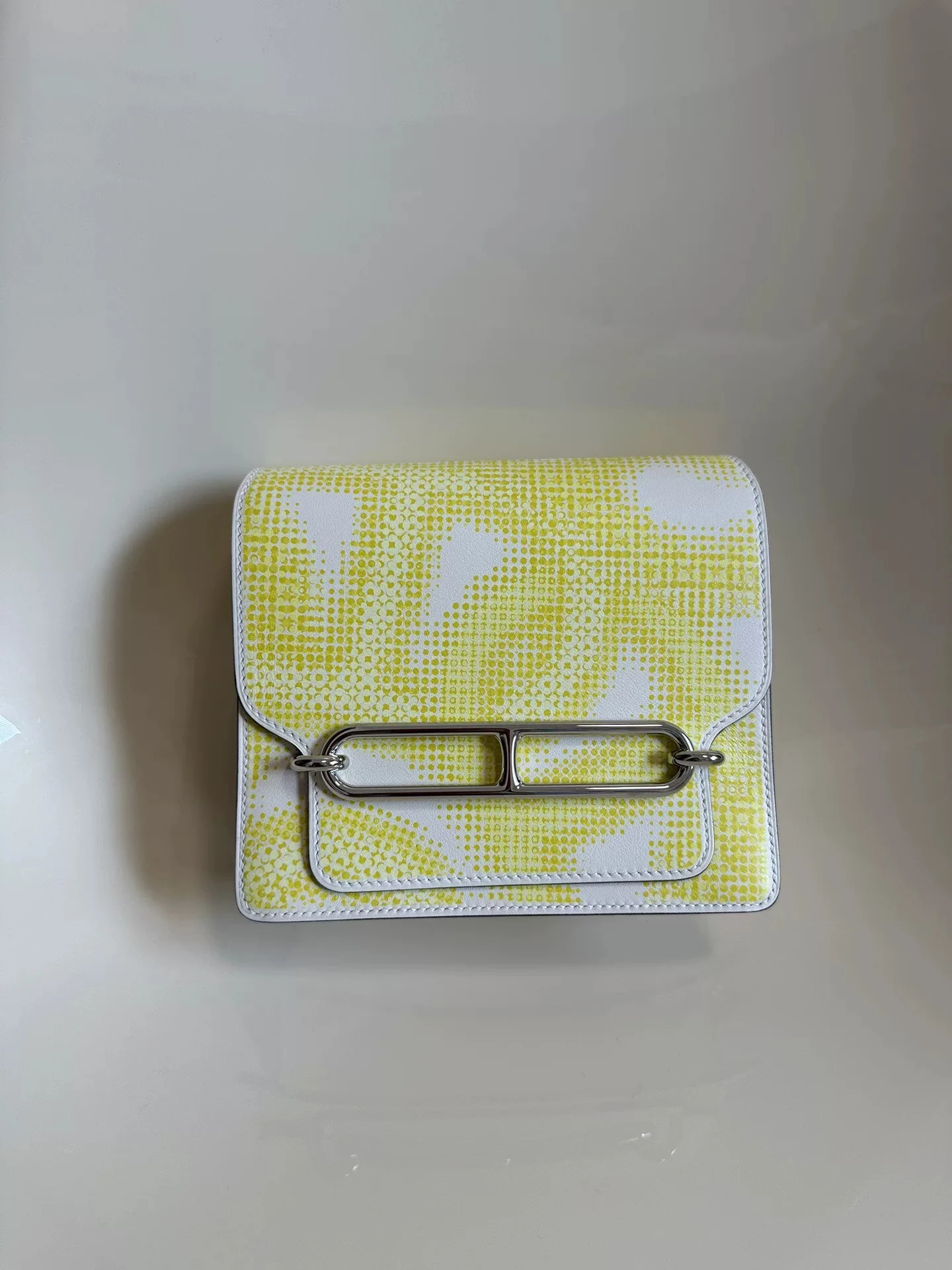 HERMÈS Roulis Mini 18 Printed Evercolor Calfskin Yellow Bag crafted from supple Evercolor calfskin with a refined satiny finish, this Roulis Mini features a rare printed design in vibrant yellow tones. With its adjustable strap for shoulder or crossbody wear, it combines everyday practicality with distinctive Hermès elegance.