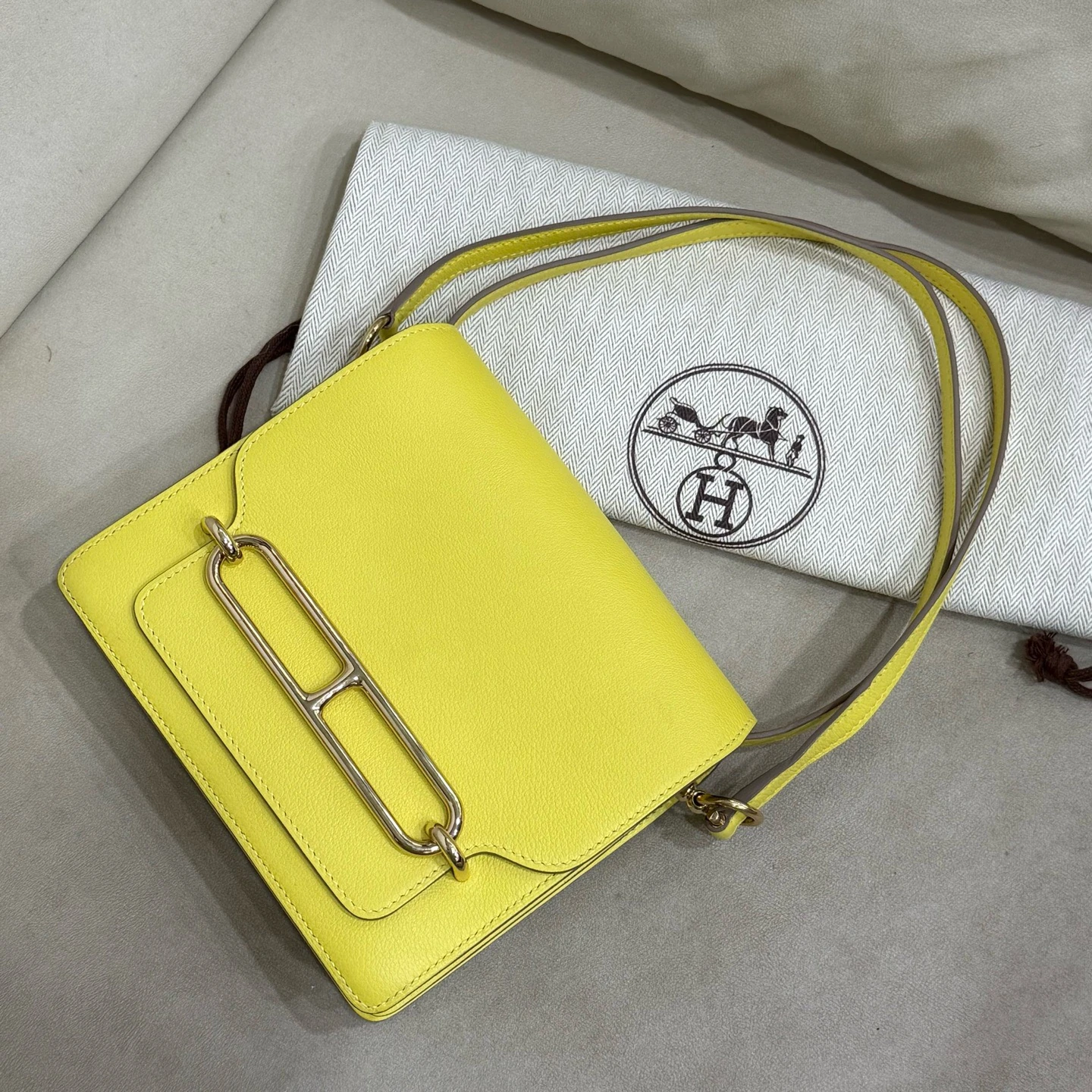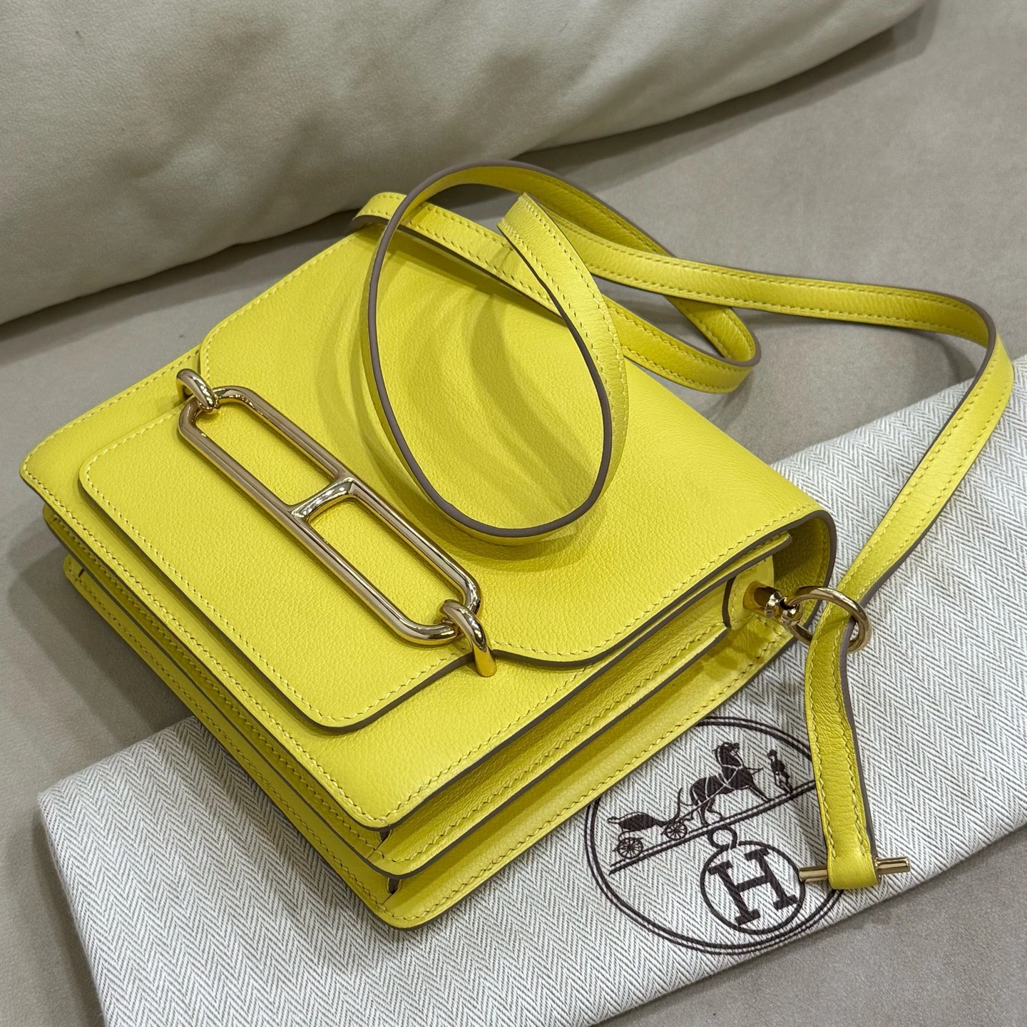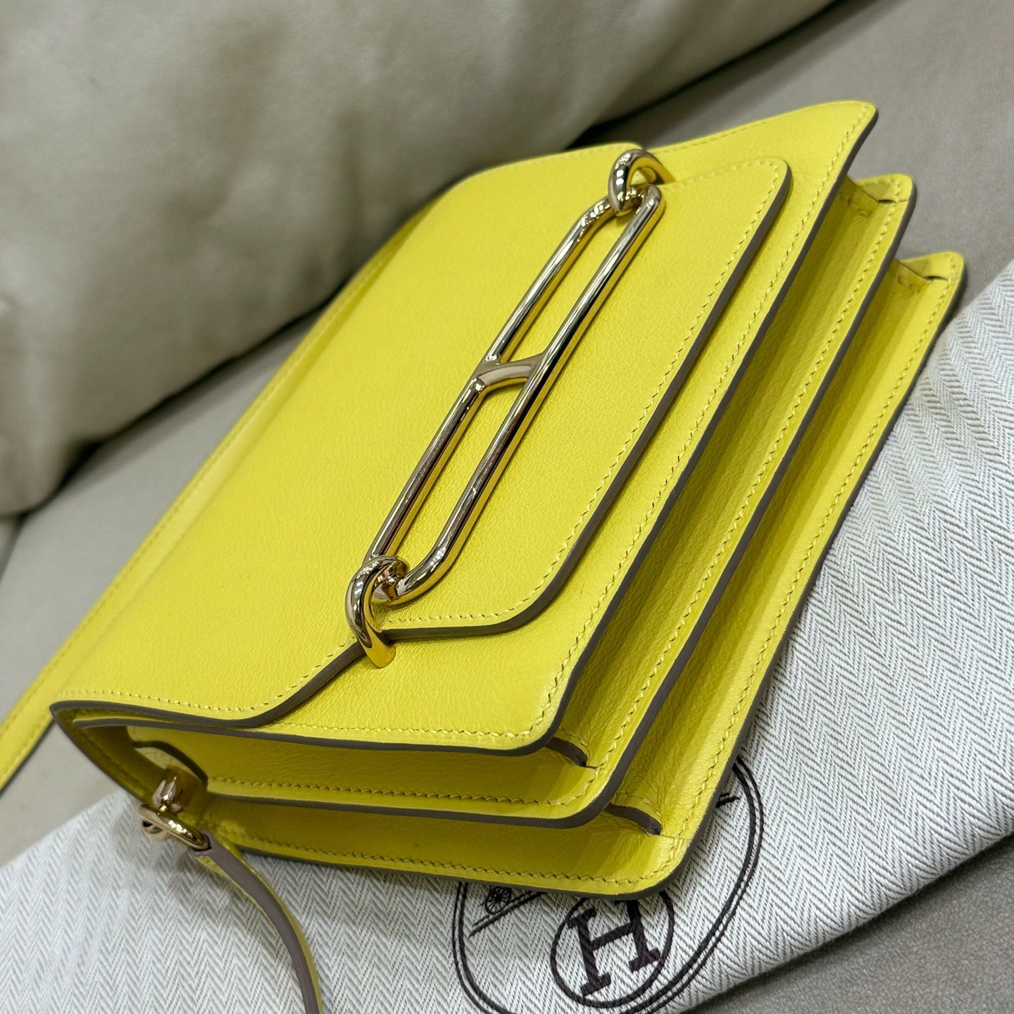 HERMÈS Roulis Mini 18 Yellow Evercolor Calfskin Bag crafted from supple Evercolor calfskin with a refined satiny finish, this Hermès Roulis Mini offers a soft yet structured silhouette. Featuring an adjustable strap for shoulder or crossbody wear, it blends everyday practicality with timeless elegance.