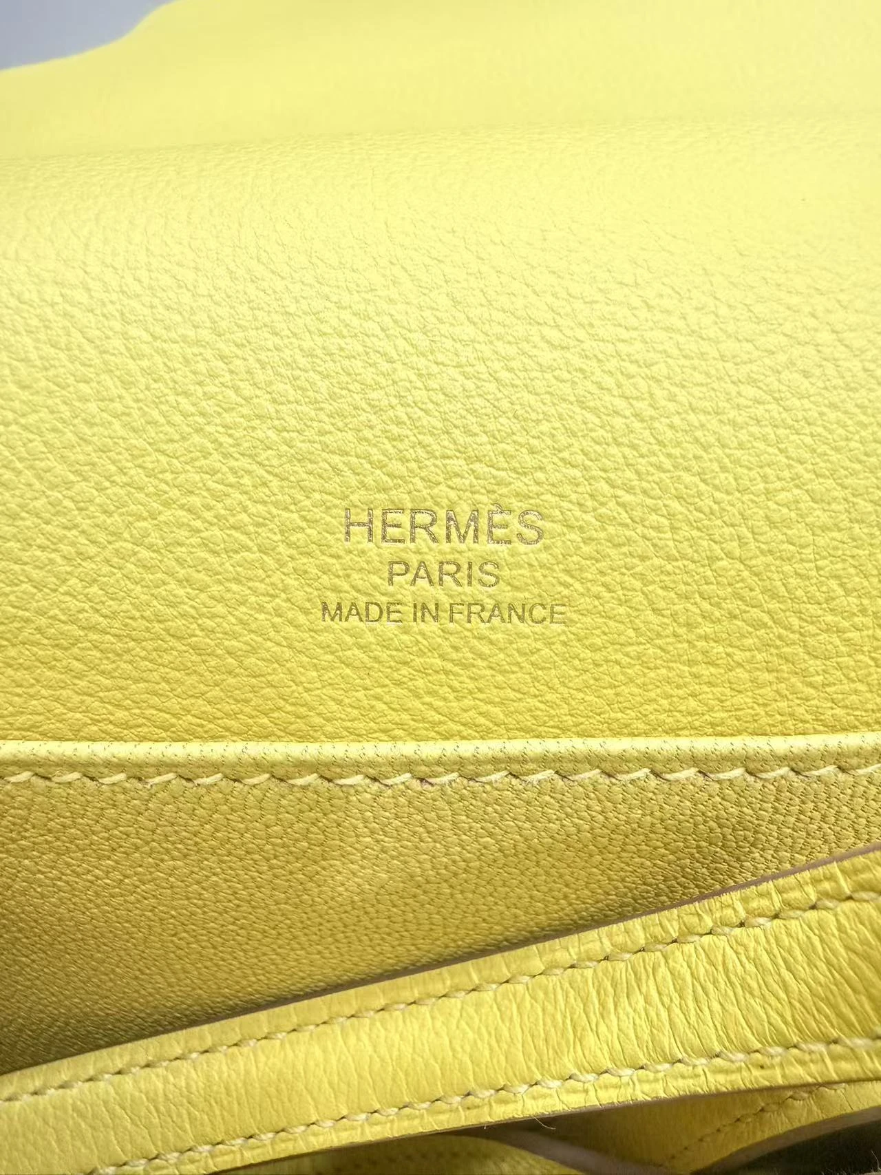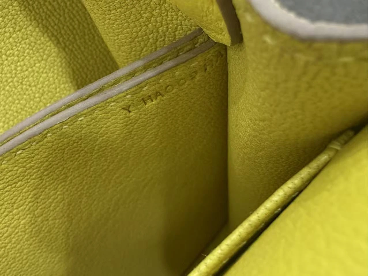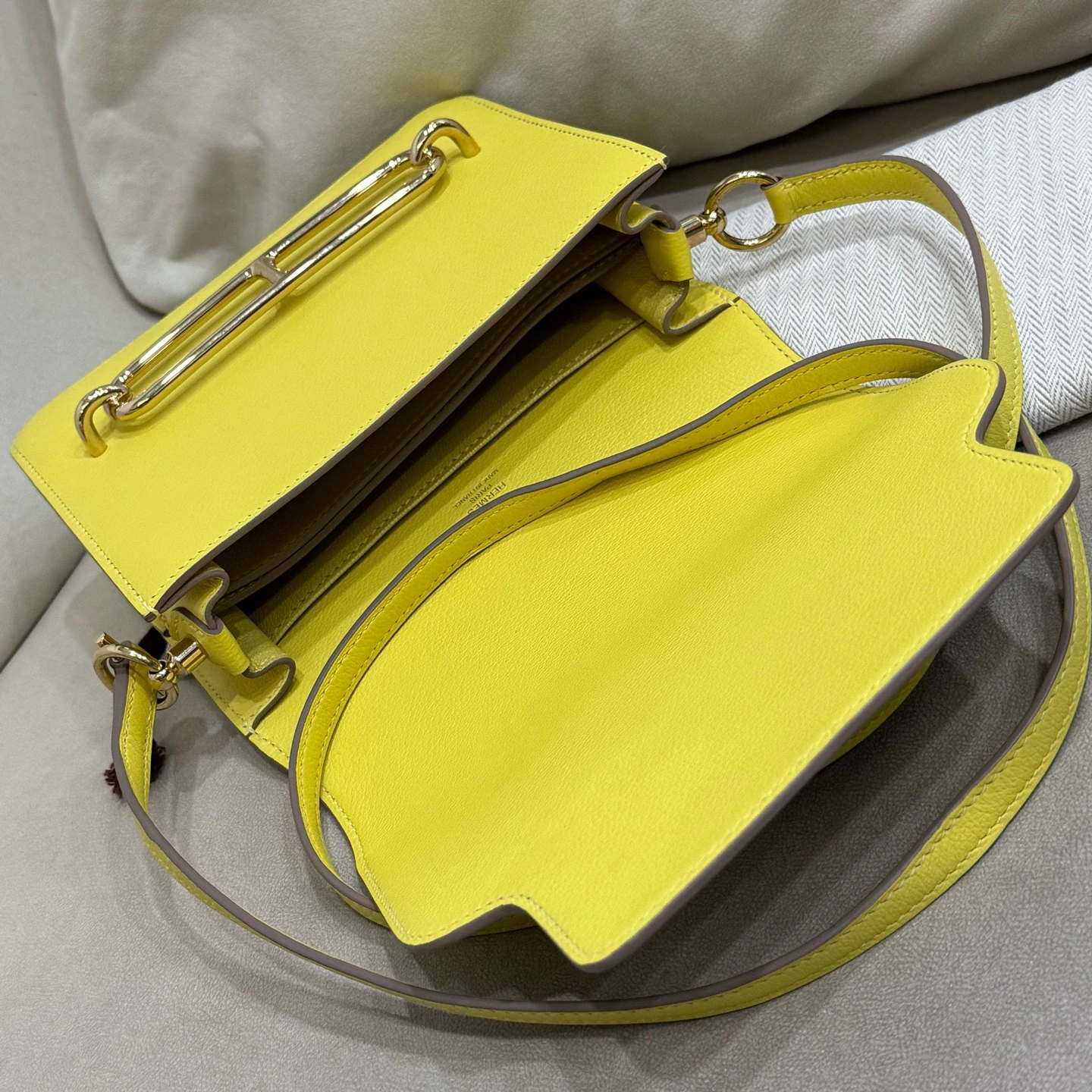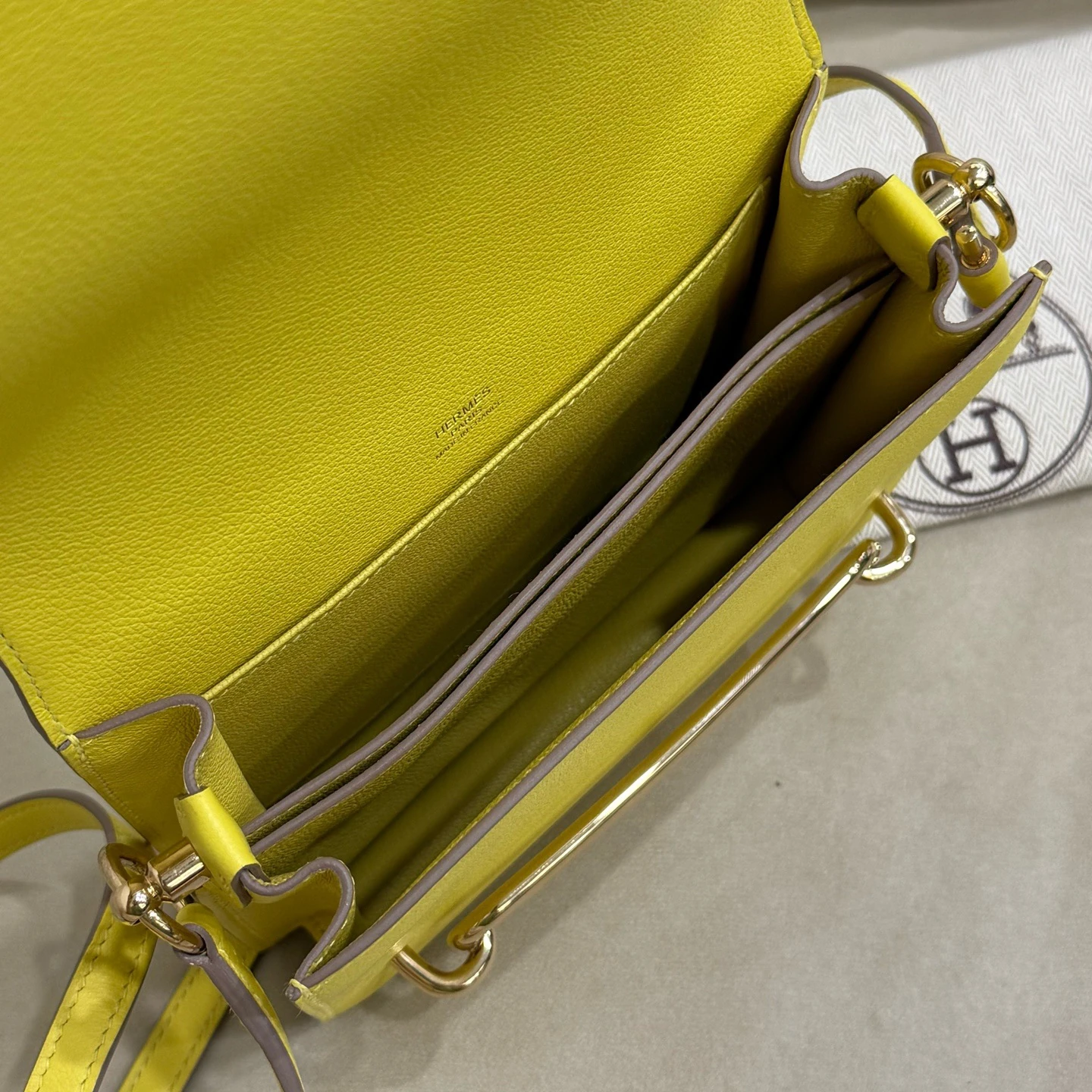 HERMÈS Roulis Mini 18 Yellow Evercolor Calfskin Bag crafted from supple Evercolor calfskin with a refined satiny finish, this Hermès Roulis Mini offers a soft yet structured silhouette. Featuring an adjustable strap for shoulder or crossbody wear, it blends everyday practicality with timeless elegance.