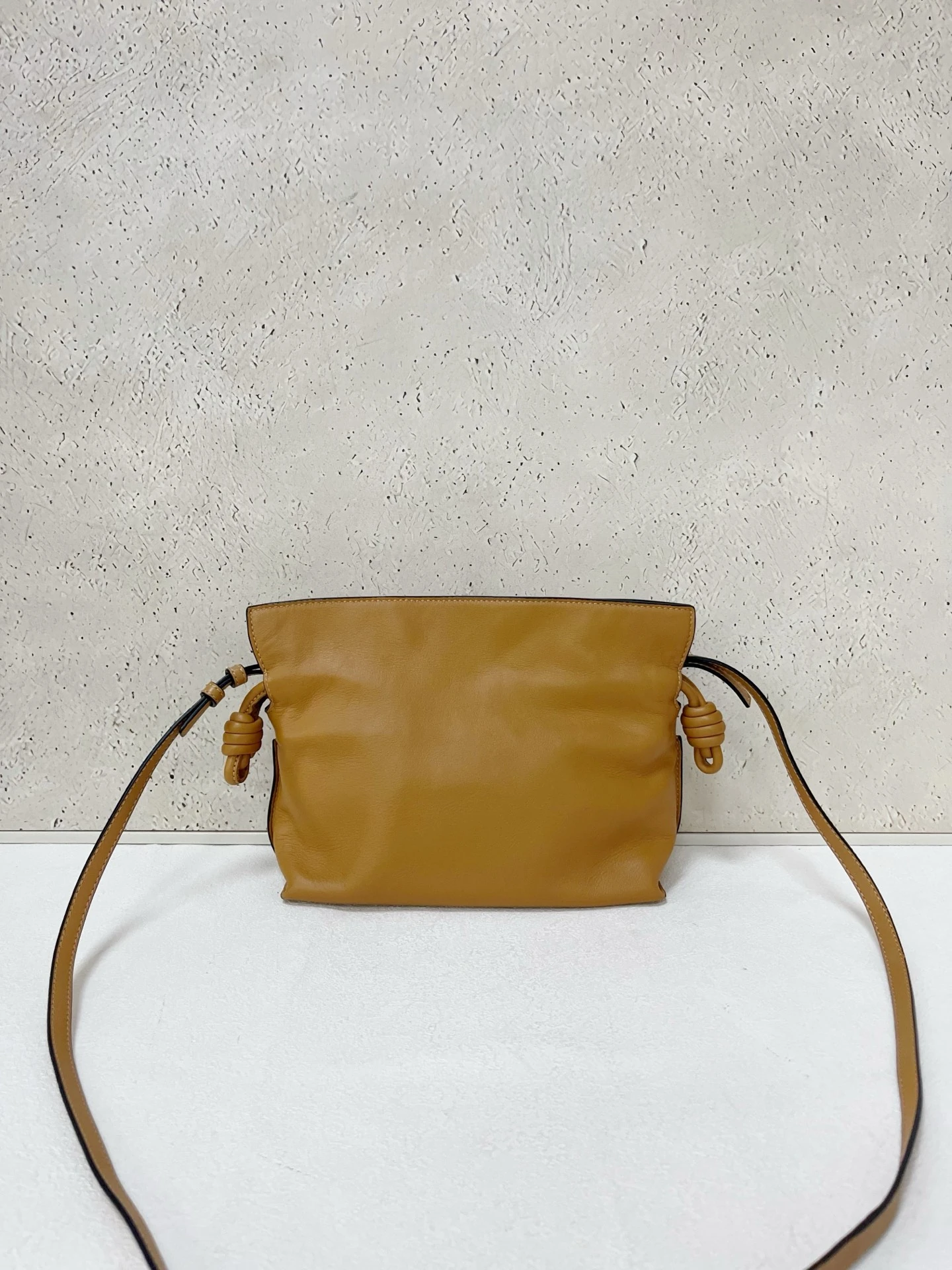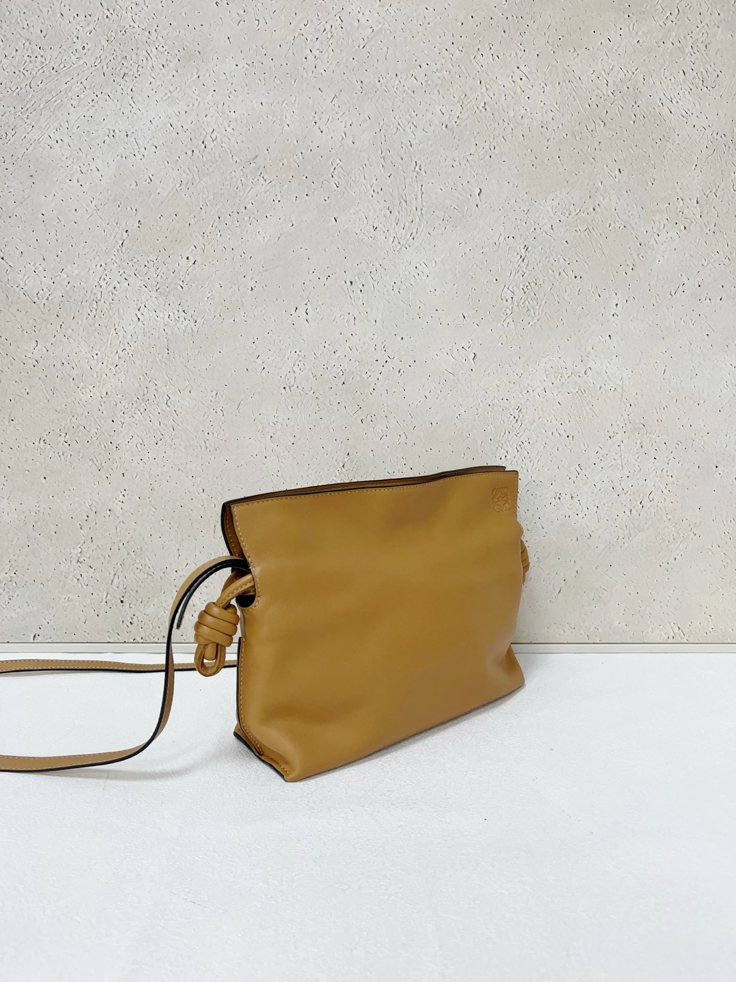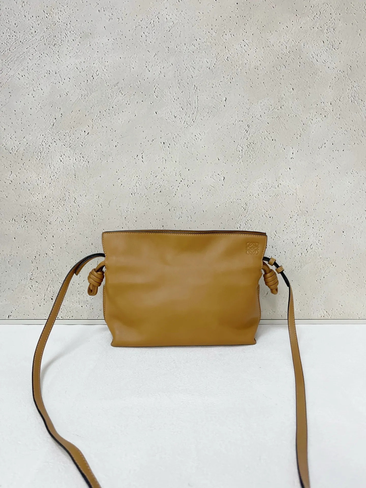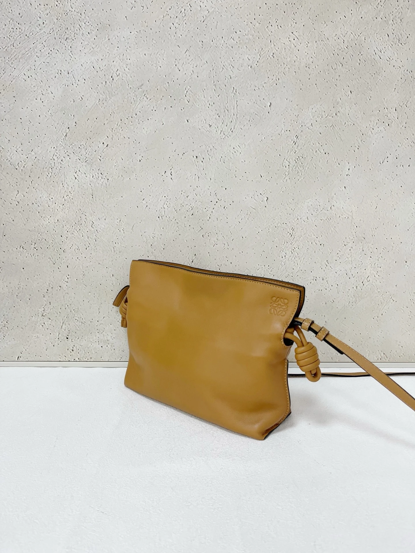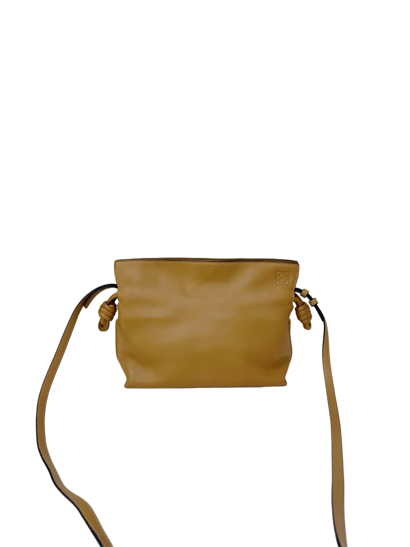 LOEWE Calfskin Mini Flamenco Knot Clutch in Warm Desert. This stunning bag is crafted of smooth calfskin leather in golden brown. The bag features an adjustable leather strap with polished gold hardware, and a knotted drawstring closure. This opens to a brown suede interior.