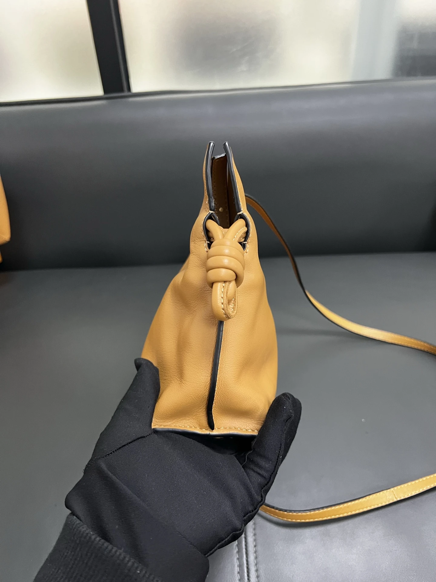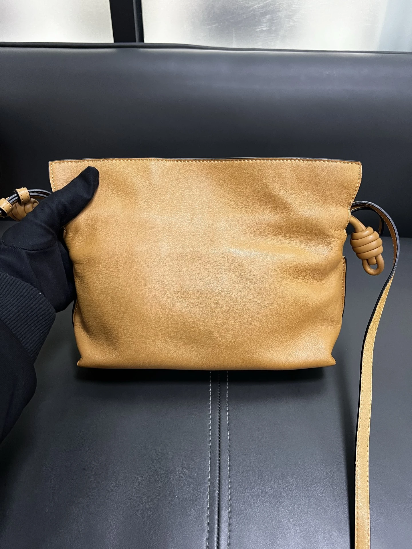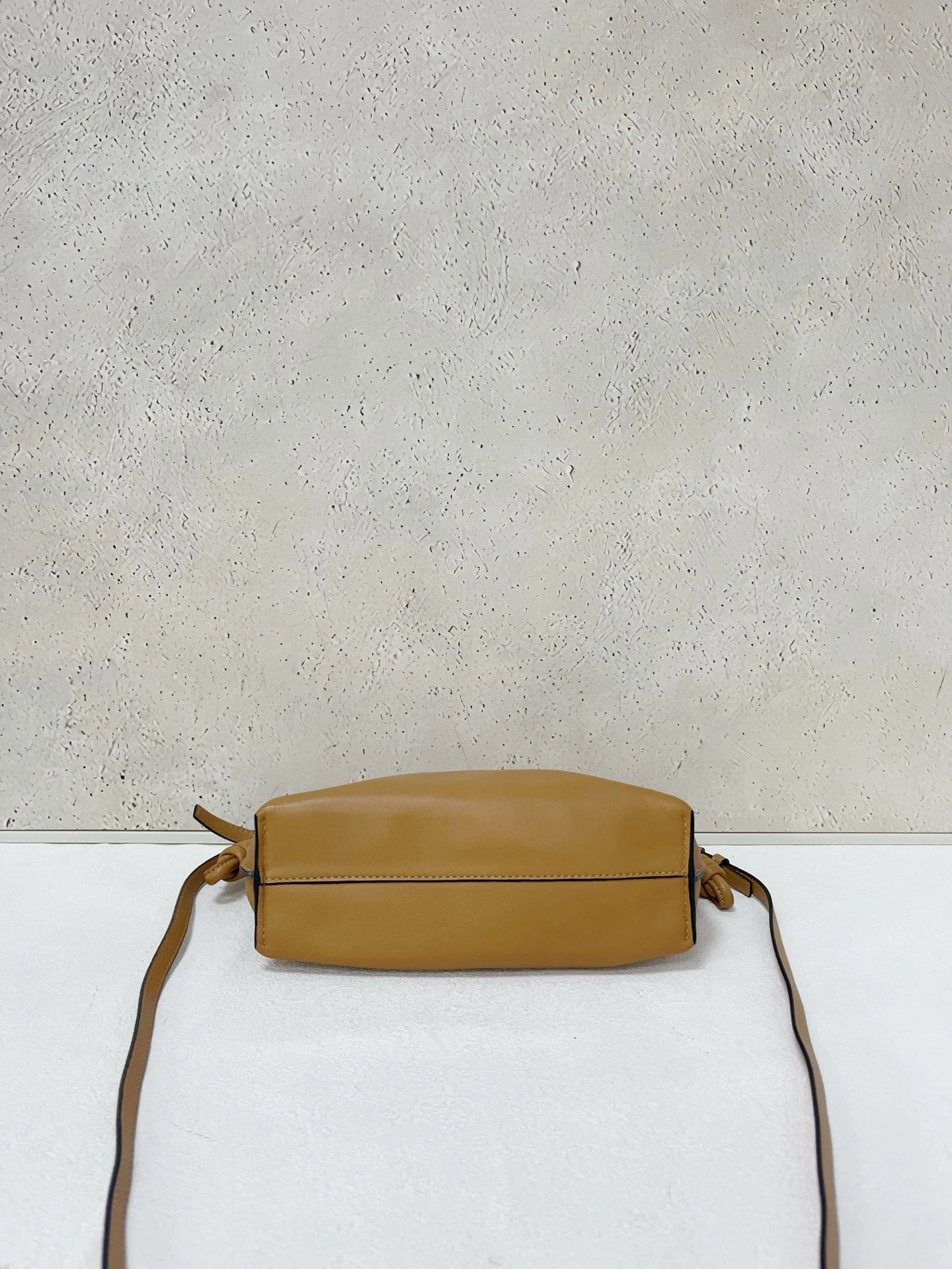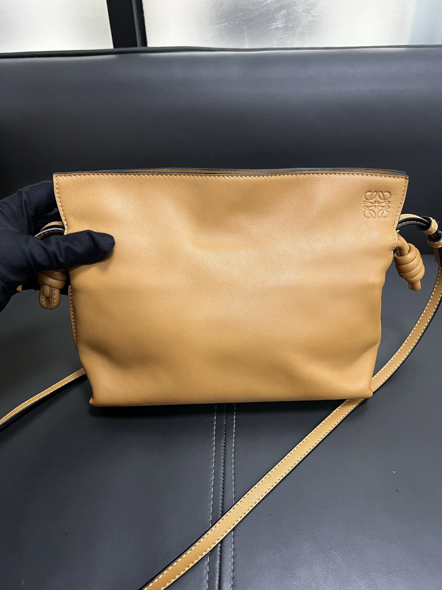 LOEWE Calfskin Mini Flamenco Knot Clutch in Warm Desert. This stunning bag is crafted of smooth calfskin leather in golden brown. The bag features an adjustable leather strap with polished gold hardware, and a knotted drawstring closure. This opens to a brown suede interior.