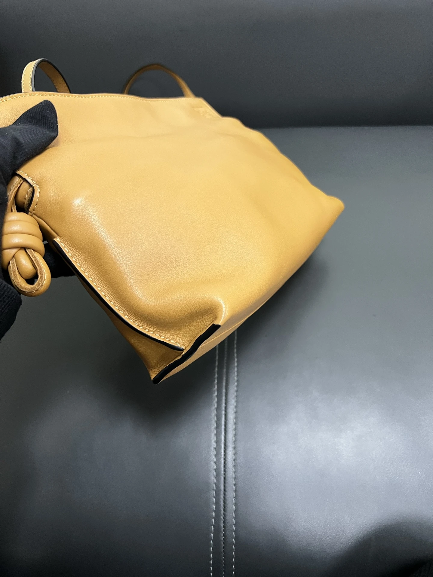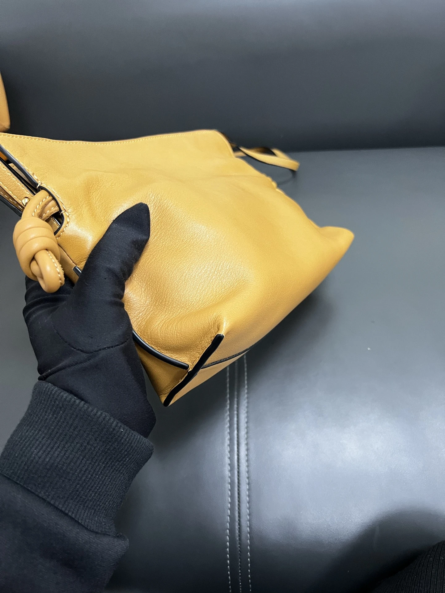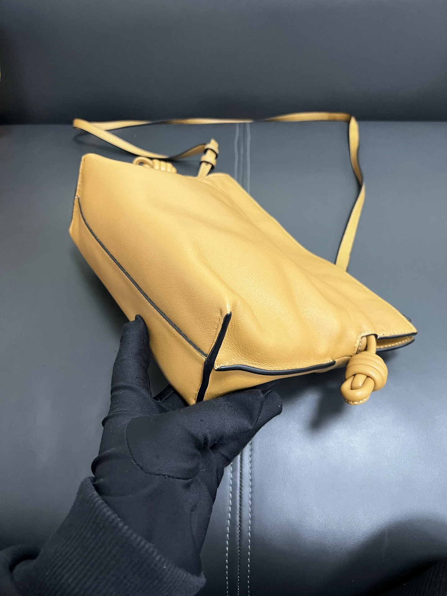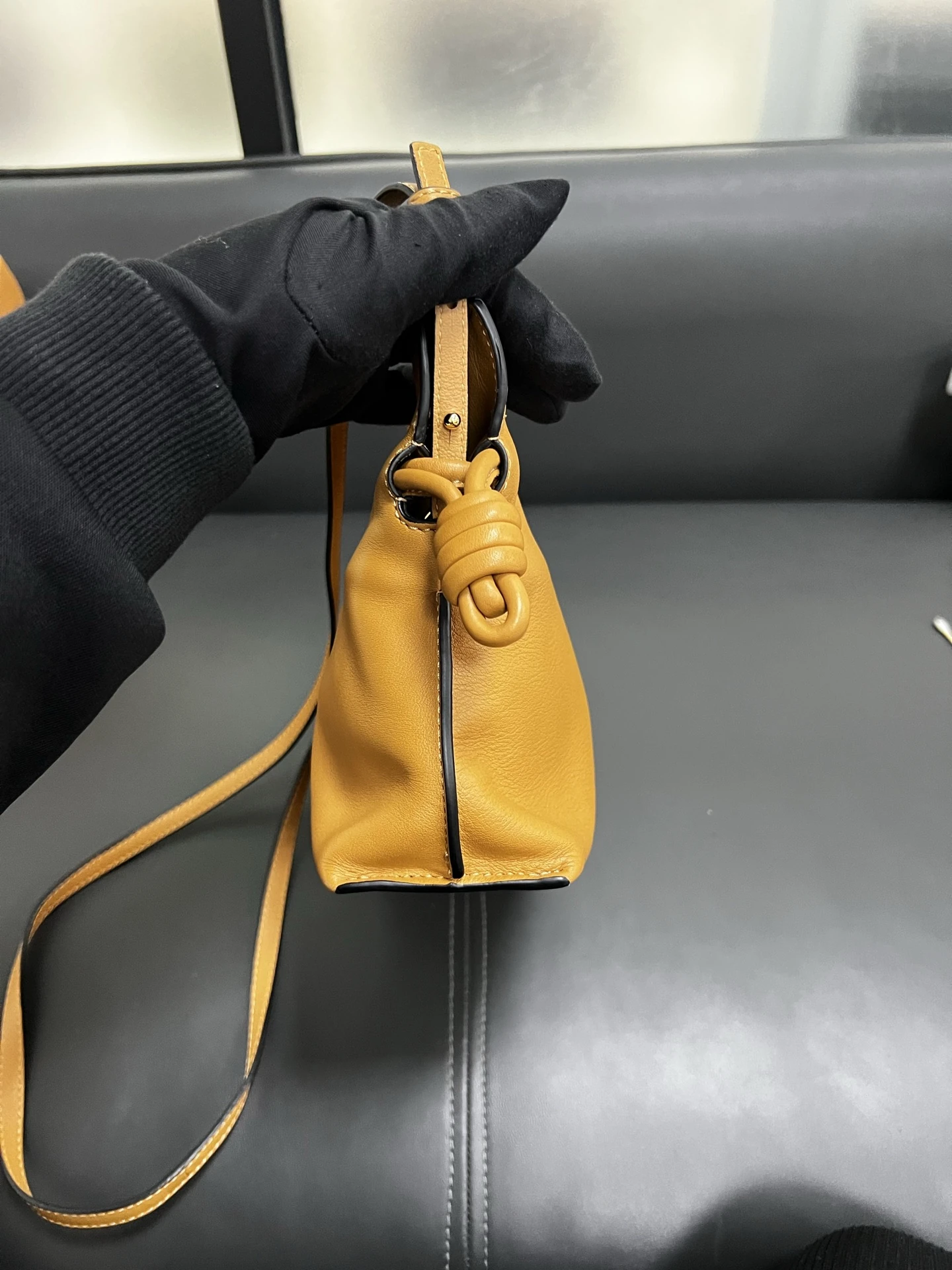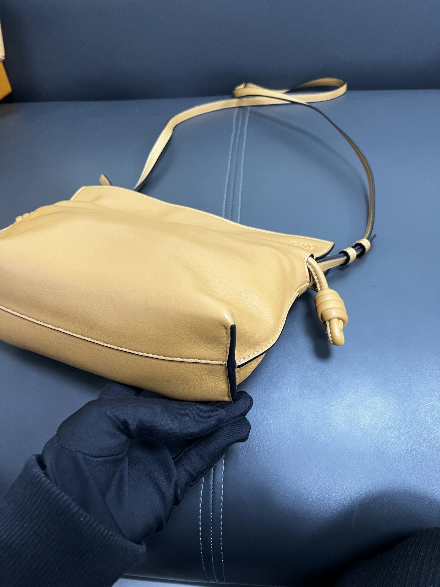 LOEWE Calfskin Mini Flamenco Knot Clutch in Warm Desert. This stunning bag is crafted of smooth calfskin leather in golden brown. The bag features an adjustable leather strap with polished gold hardware, and a knotted drawstring closure. This opens to a brown suede interior.