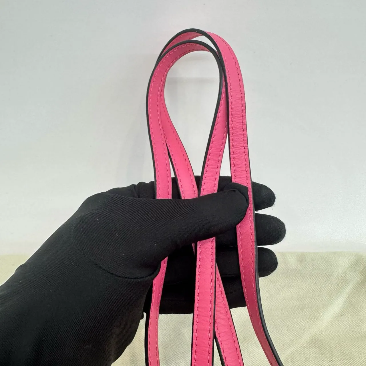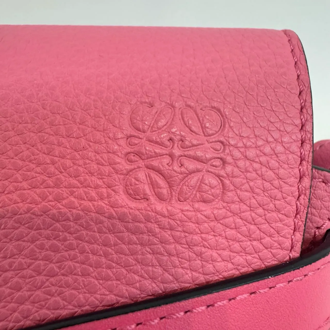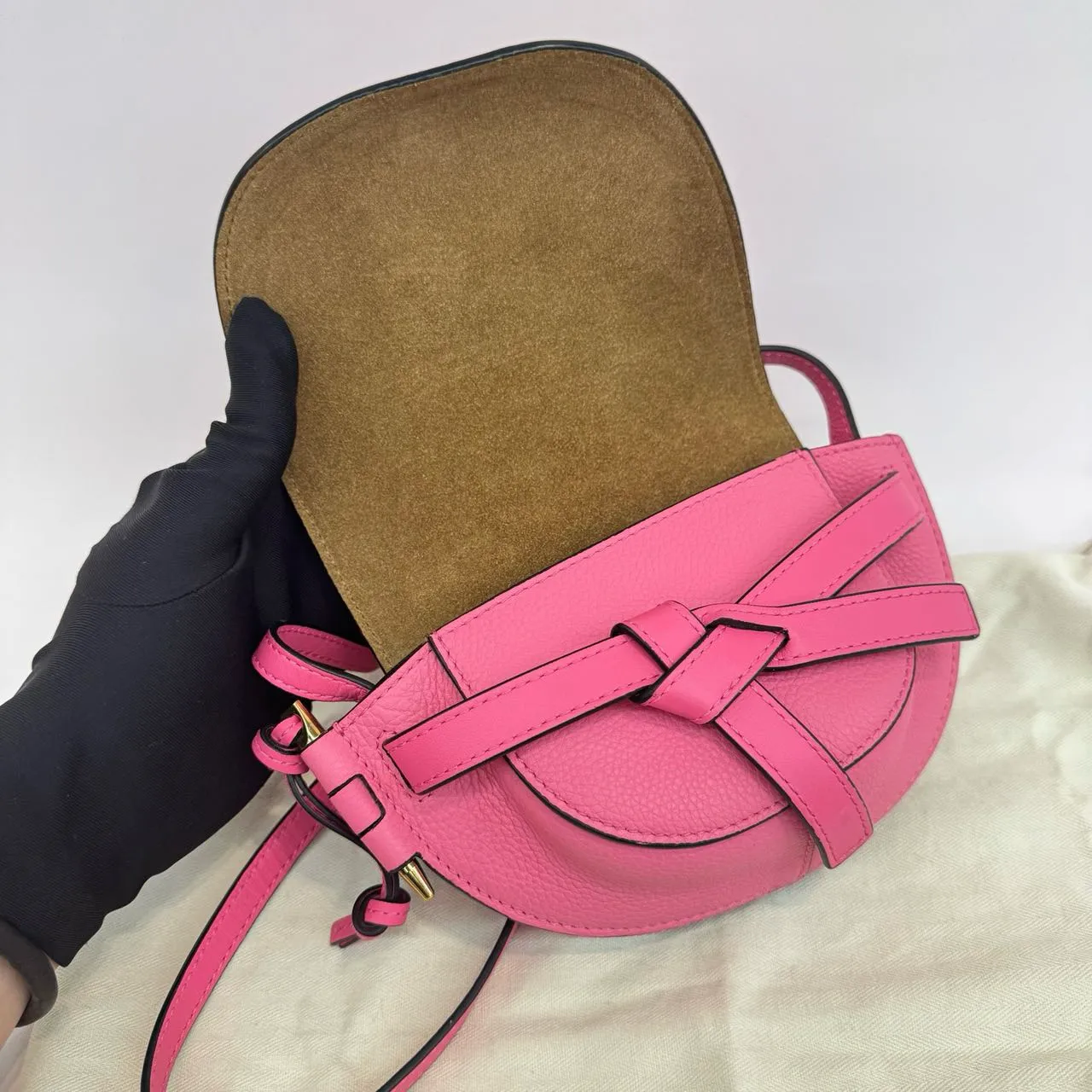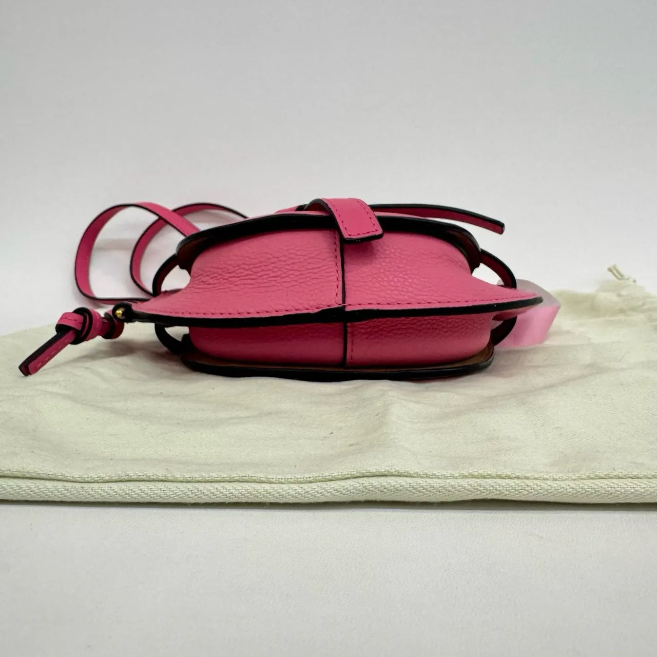 The LOEWE Mini Gate crossbody in bright pink grained calfskin features the iconic knotted flap closure and an adjustable leather strap. Its suede interior includes a practical patch pocket, accented by gleaming gold hardware. A vibrant and sophisticated statement piece.