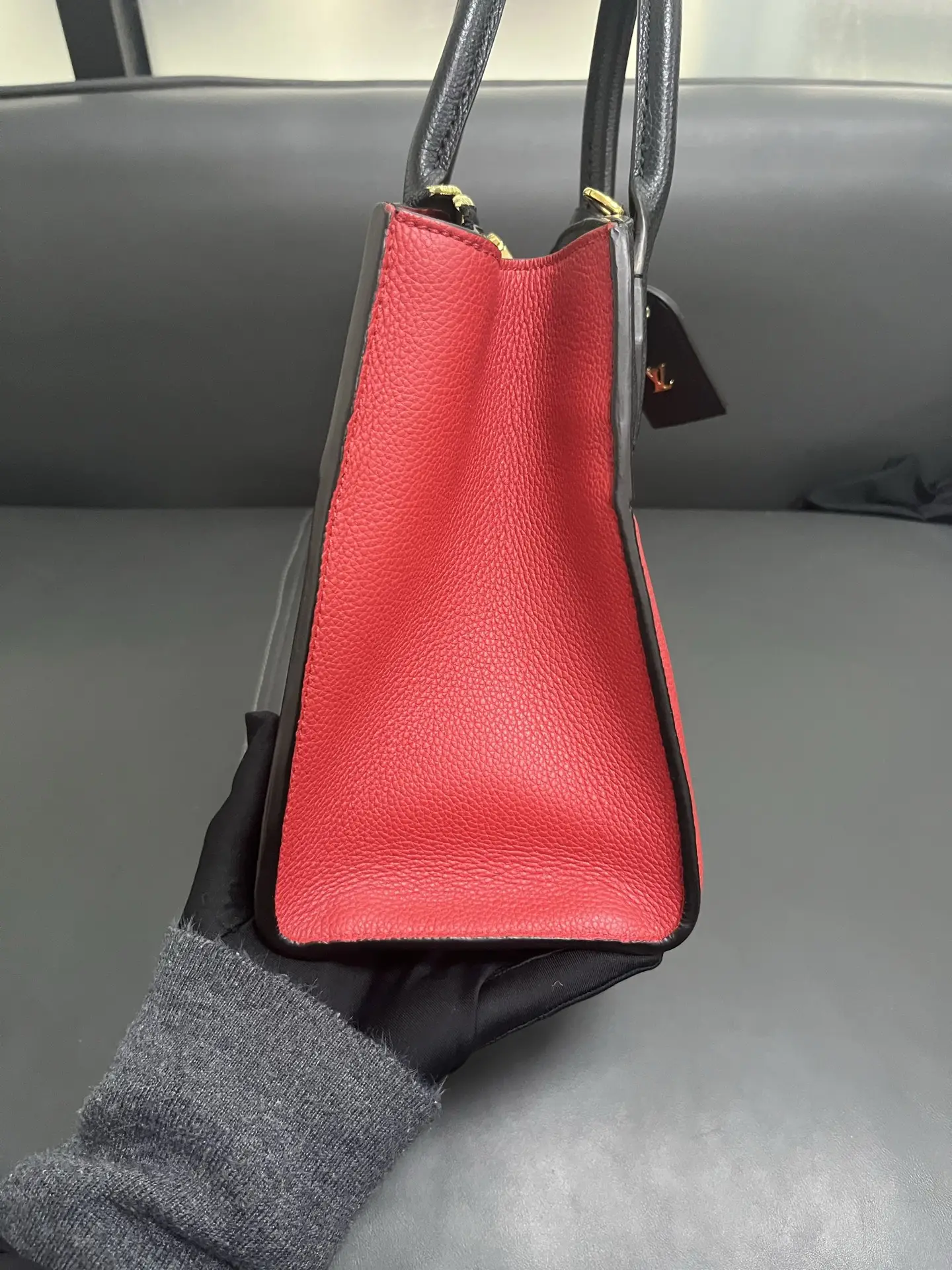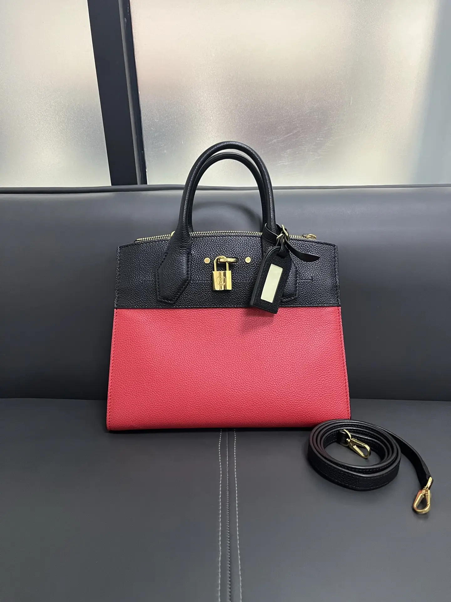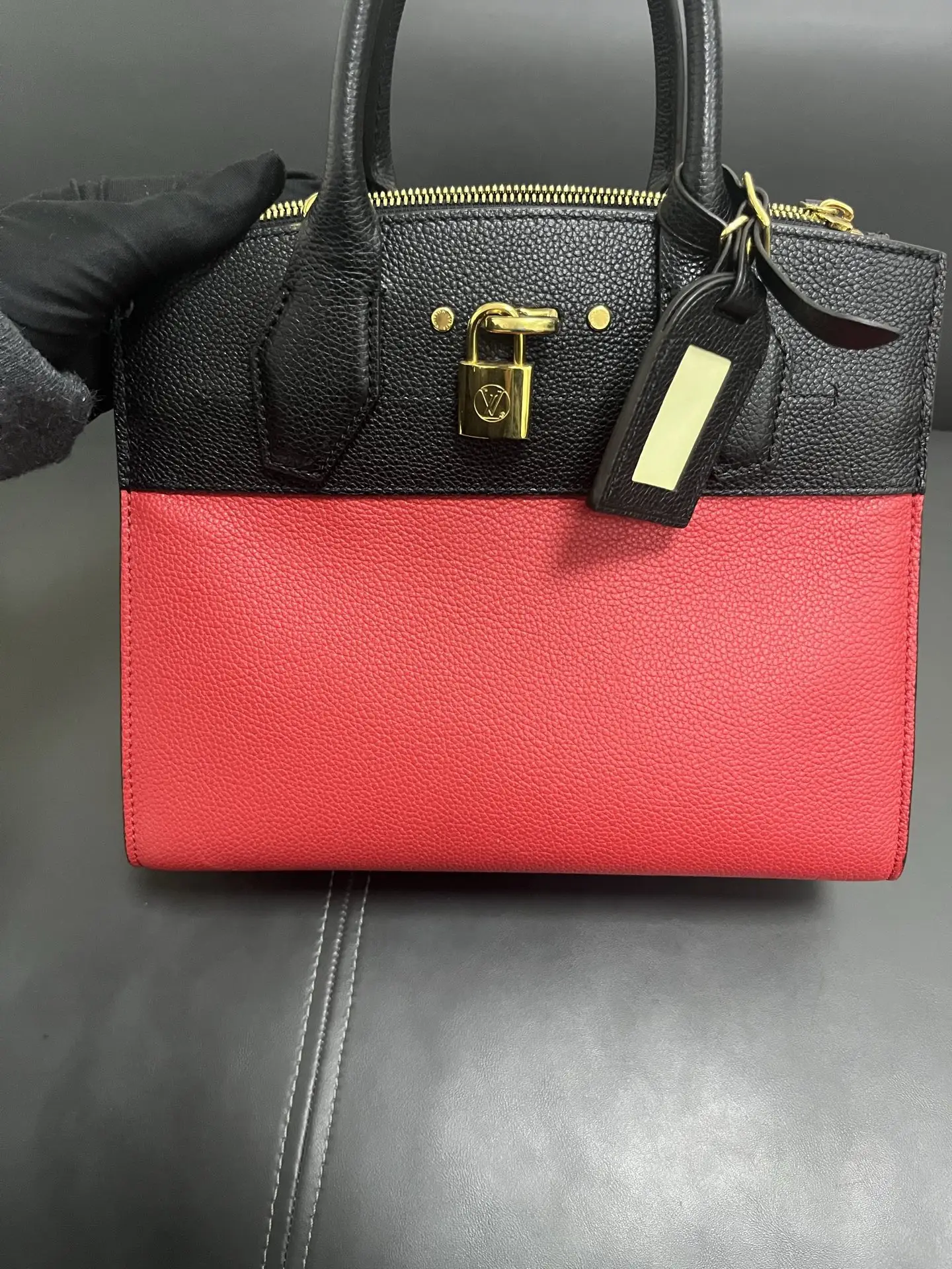 The LOUIS VUITTON City Steamer PM Bag in red and black leather is a statement of structured modern luxury, combining the brand’s signature trunk-inspired silhouette and padlock closure with a bold two-tone color palette for a powerful and sophisticated urban accessory.
