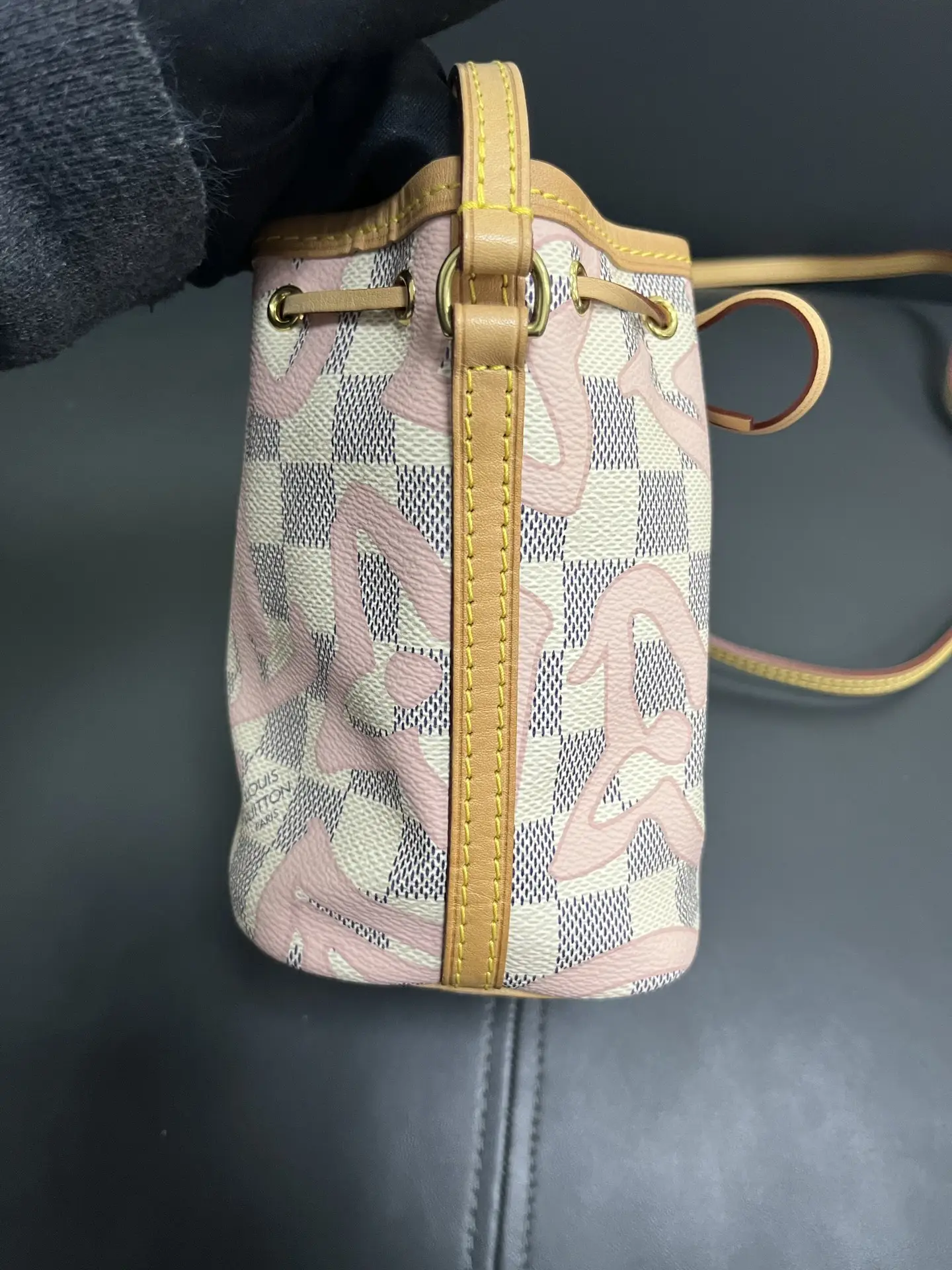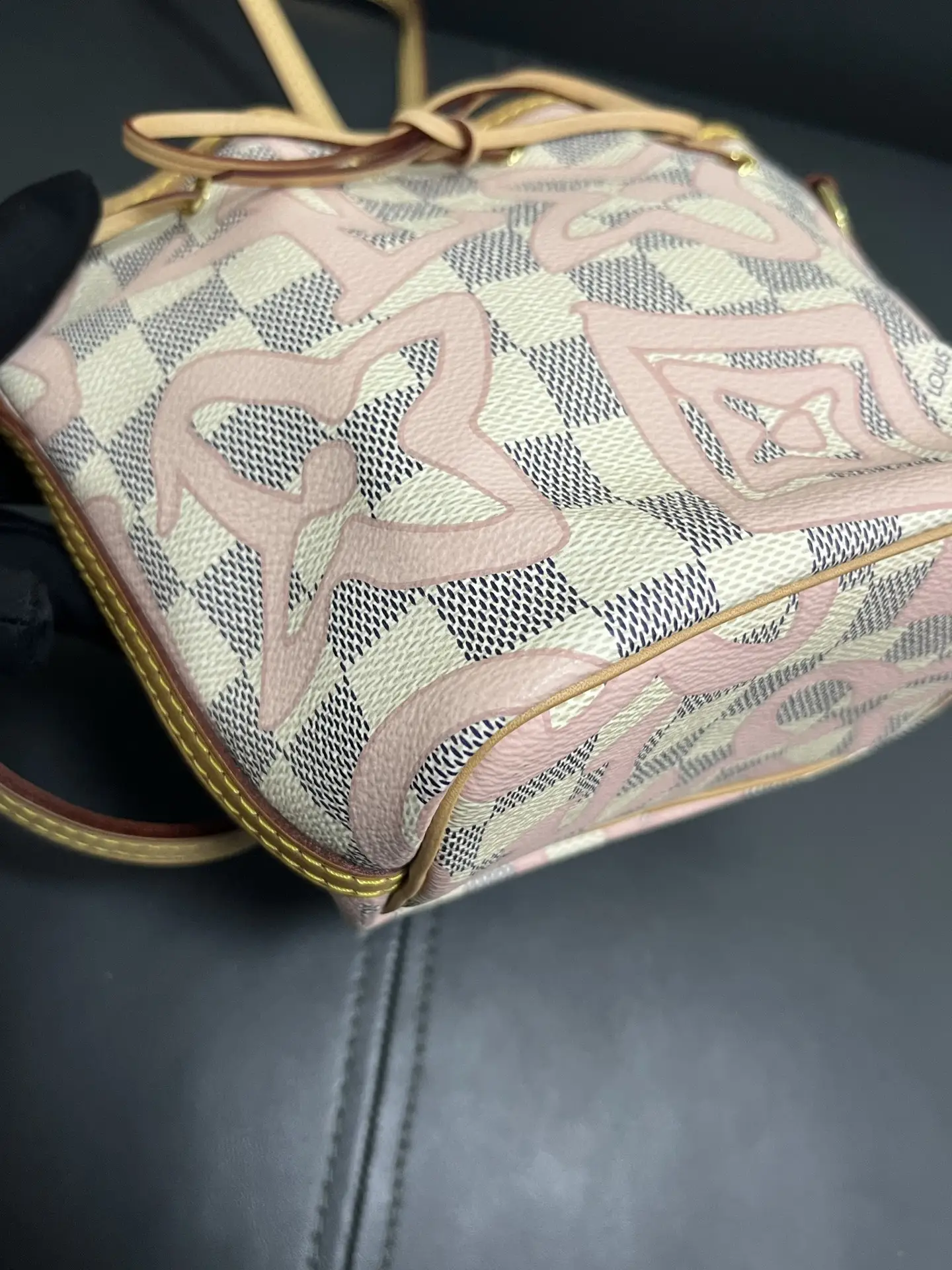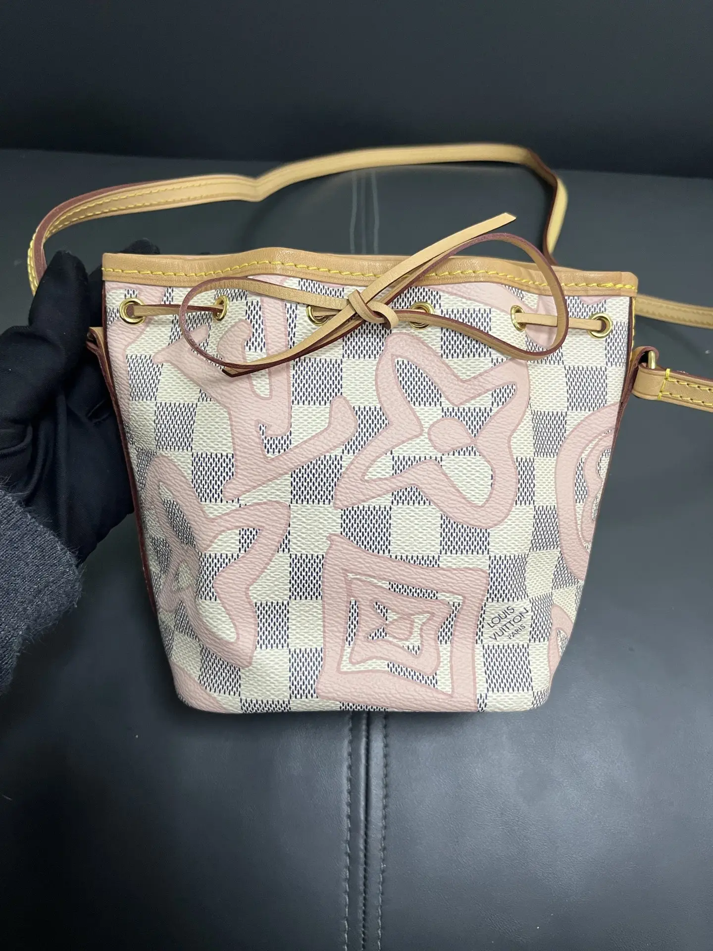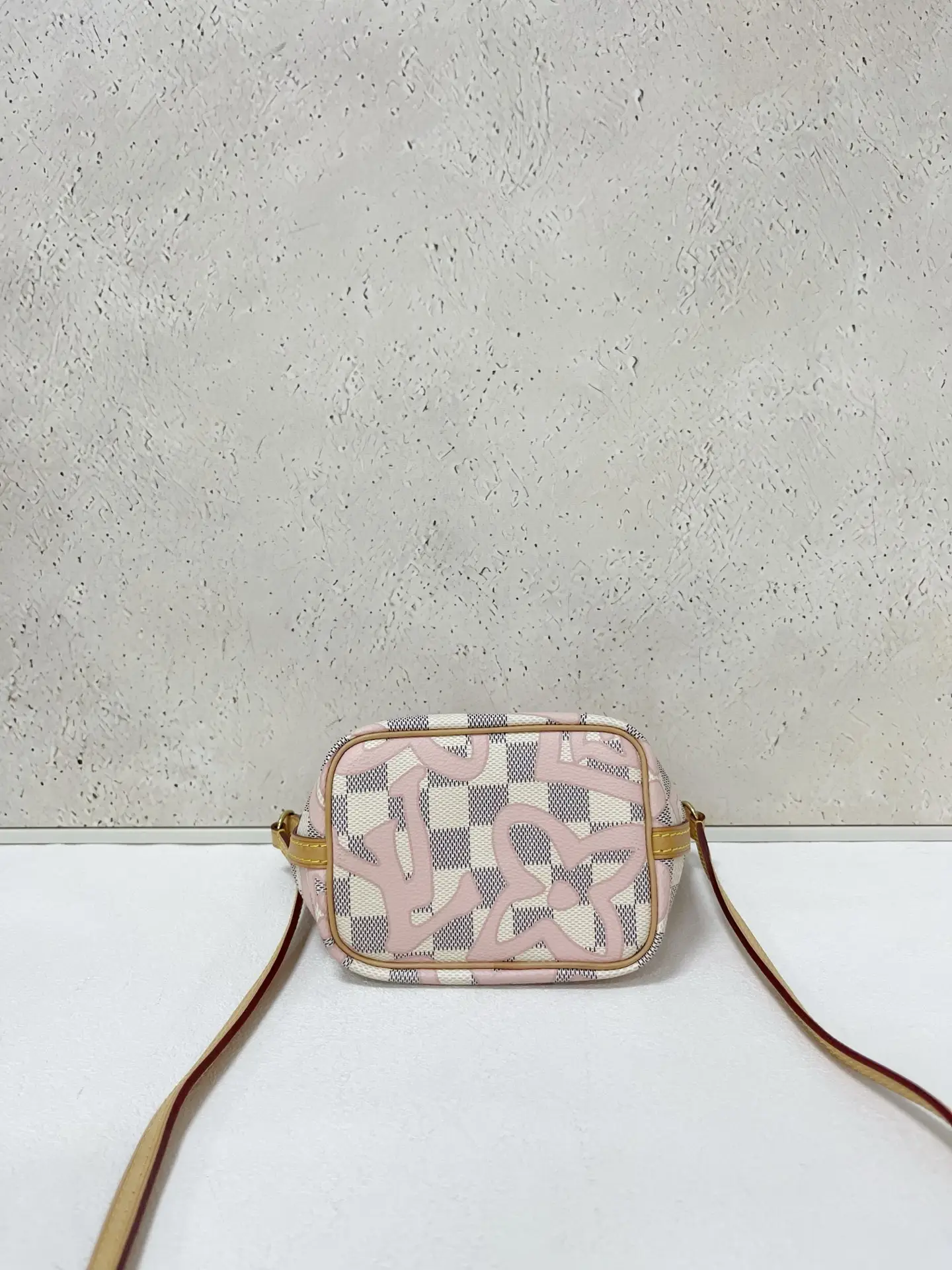 The Louis Vuitton Damier Azur Tahitienne Nano Noé bag in Rose Ballerine is a whimsical and limited seasonal piece, combining the classic checkerboard canvas with tropical floral prints and a delicate pink lining, reimagining the iconic bucket silhouette in a playful, miniature format.