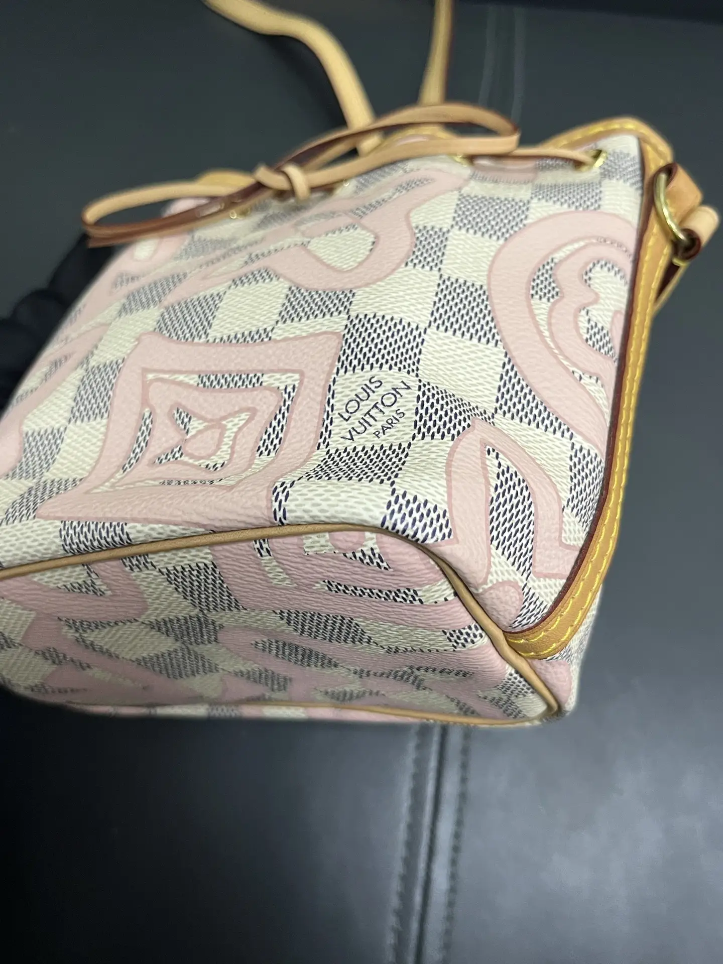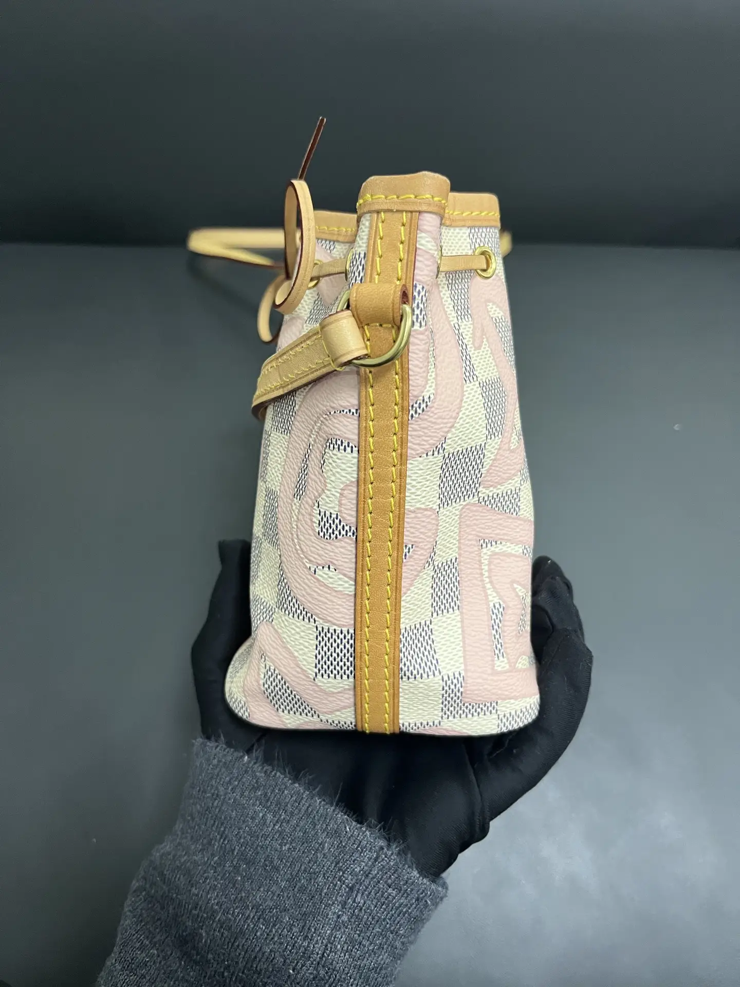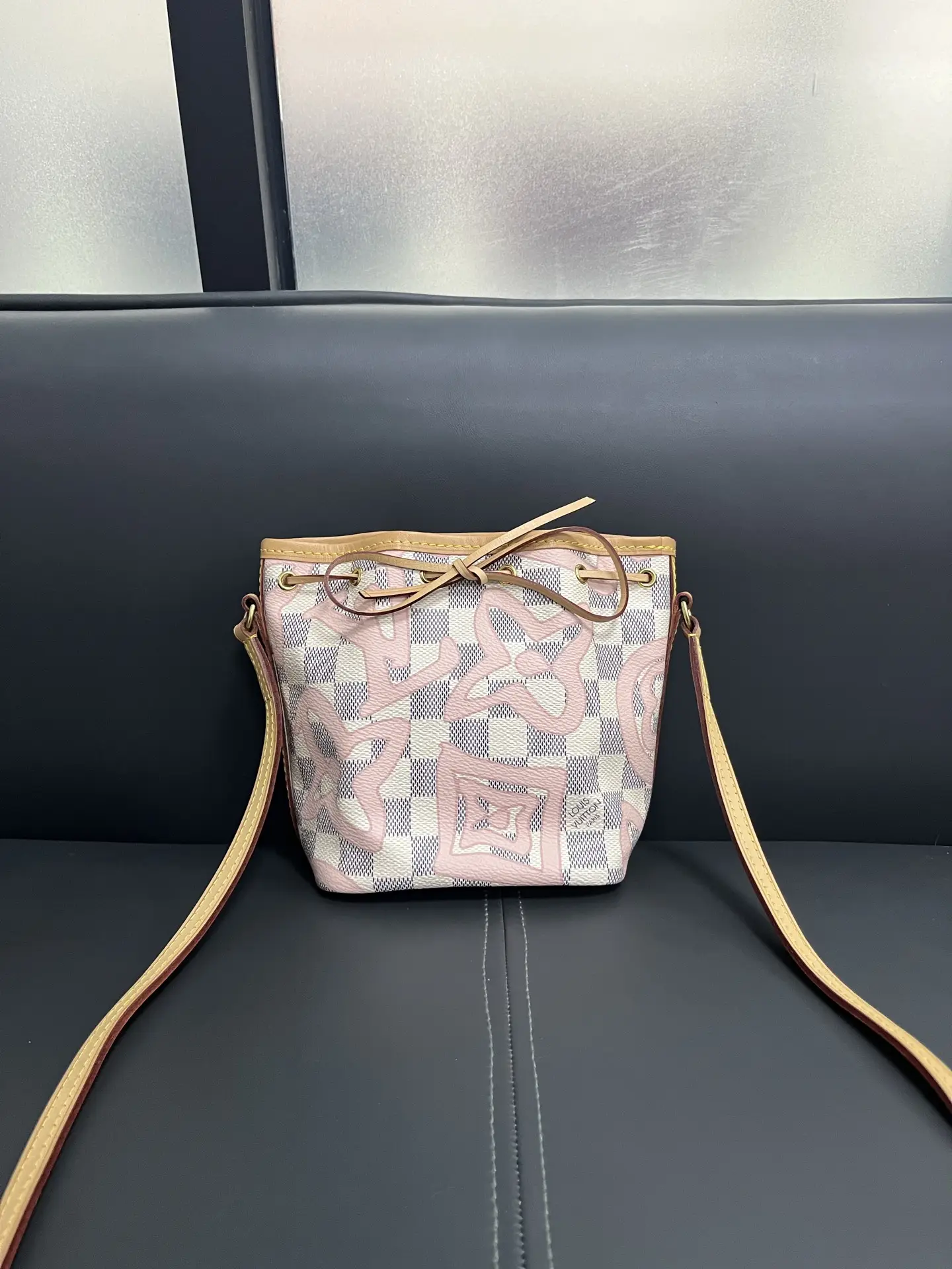 The Louis Vuitton Damier Azur Tahitienne Nano Noé bag in Rose Ballerine is a whimsical and limited seasonal piece, combining the classic checkerboard canvas with tropical floral prints and a delicate pink lining, reimagining the iconic bucket silhouette in a playful, miniature format.