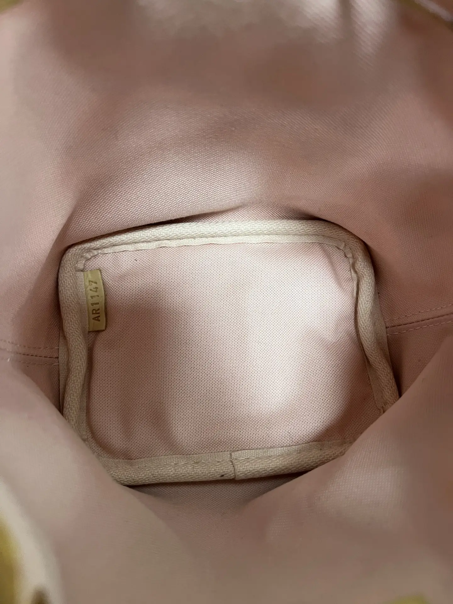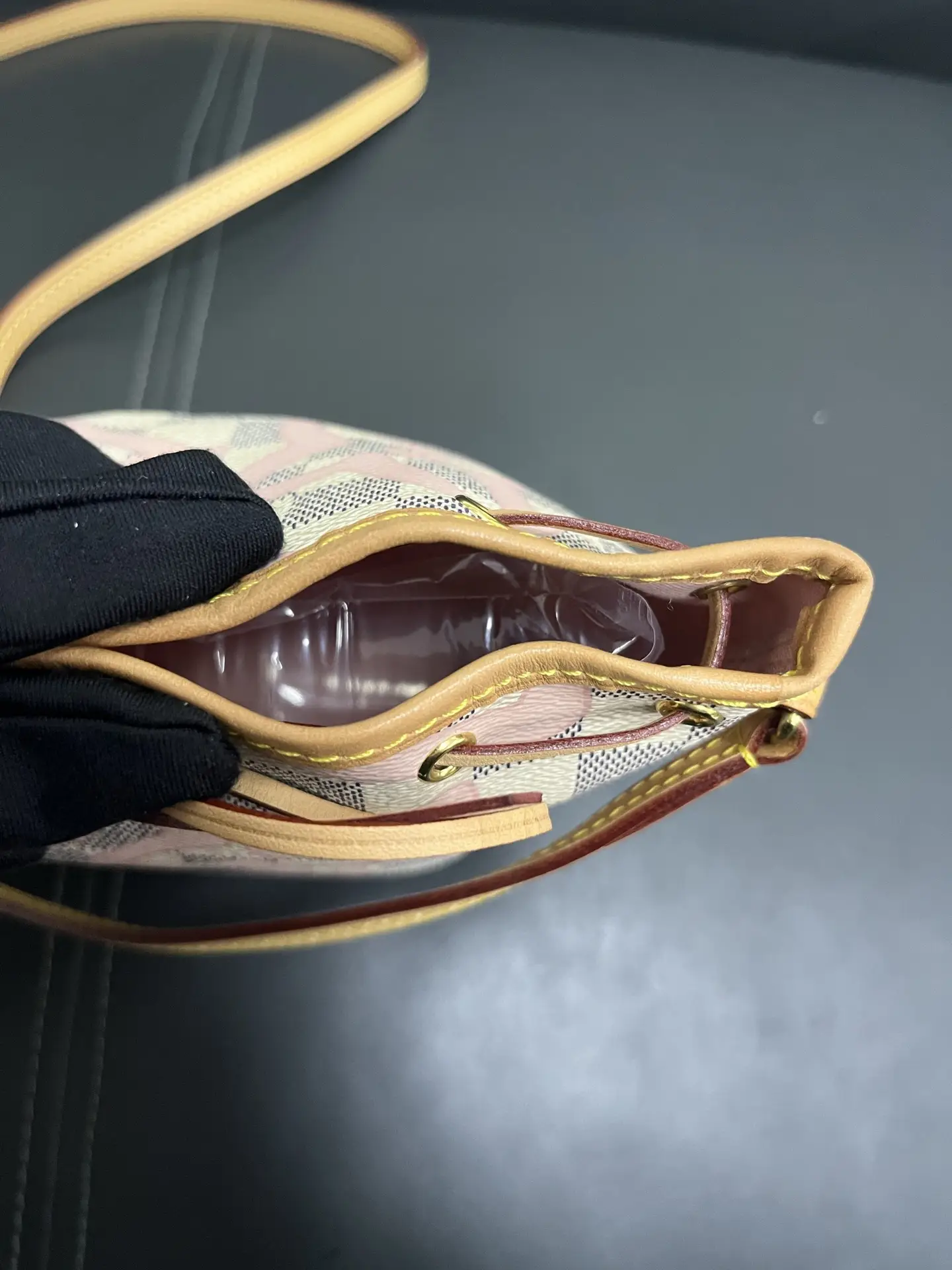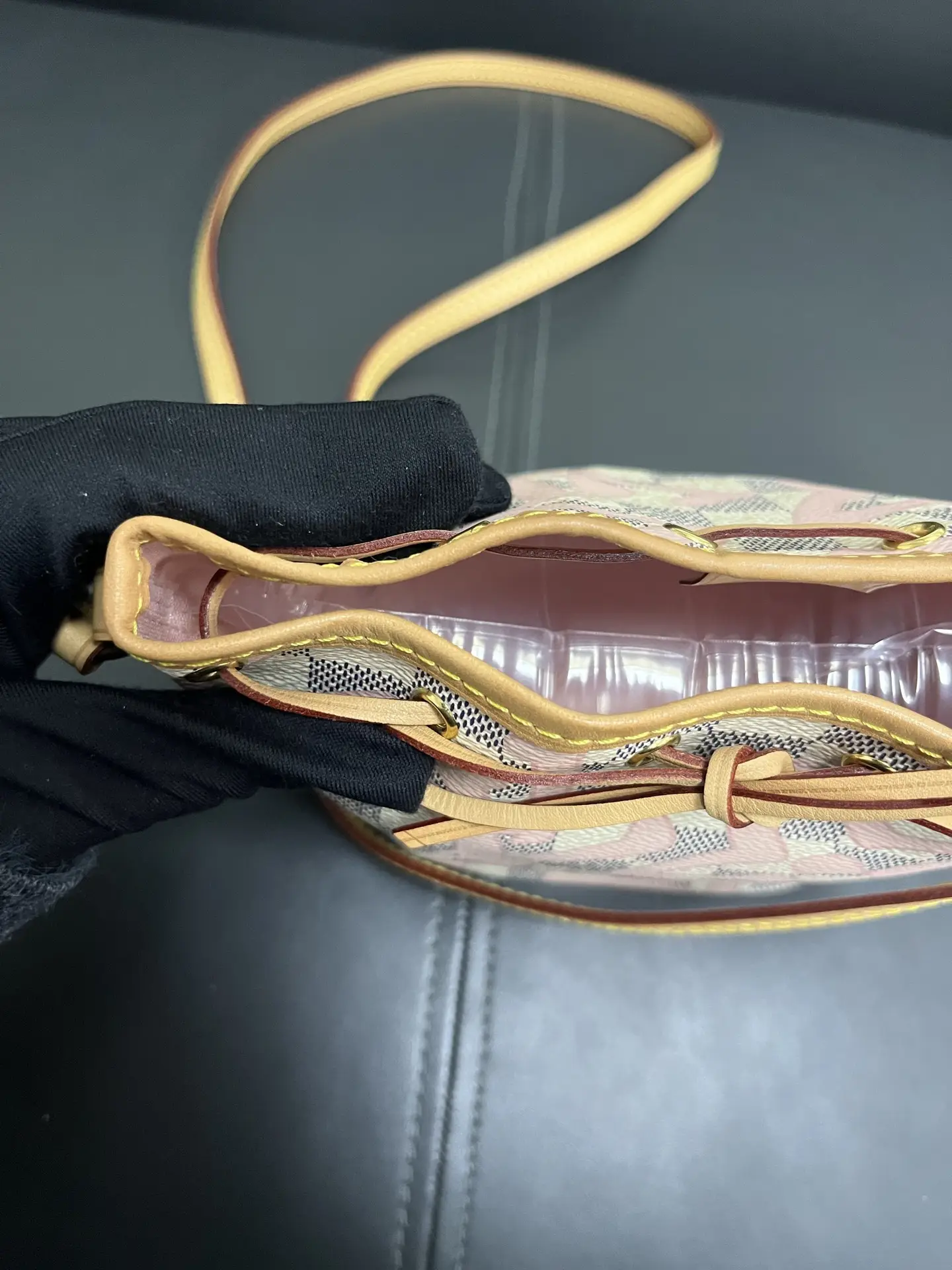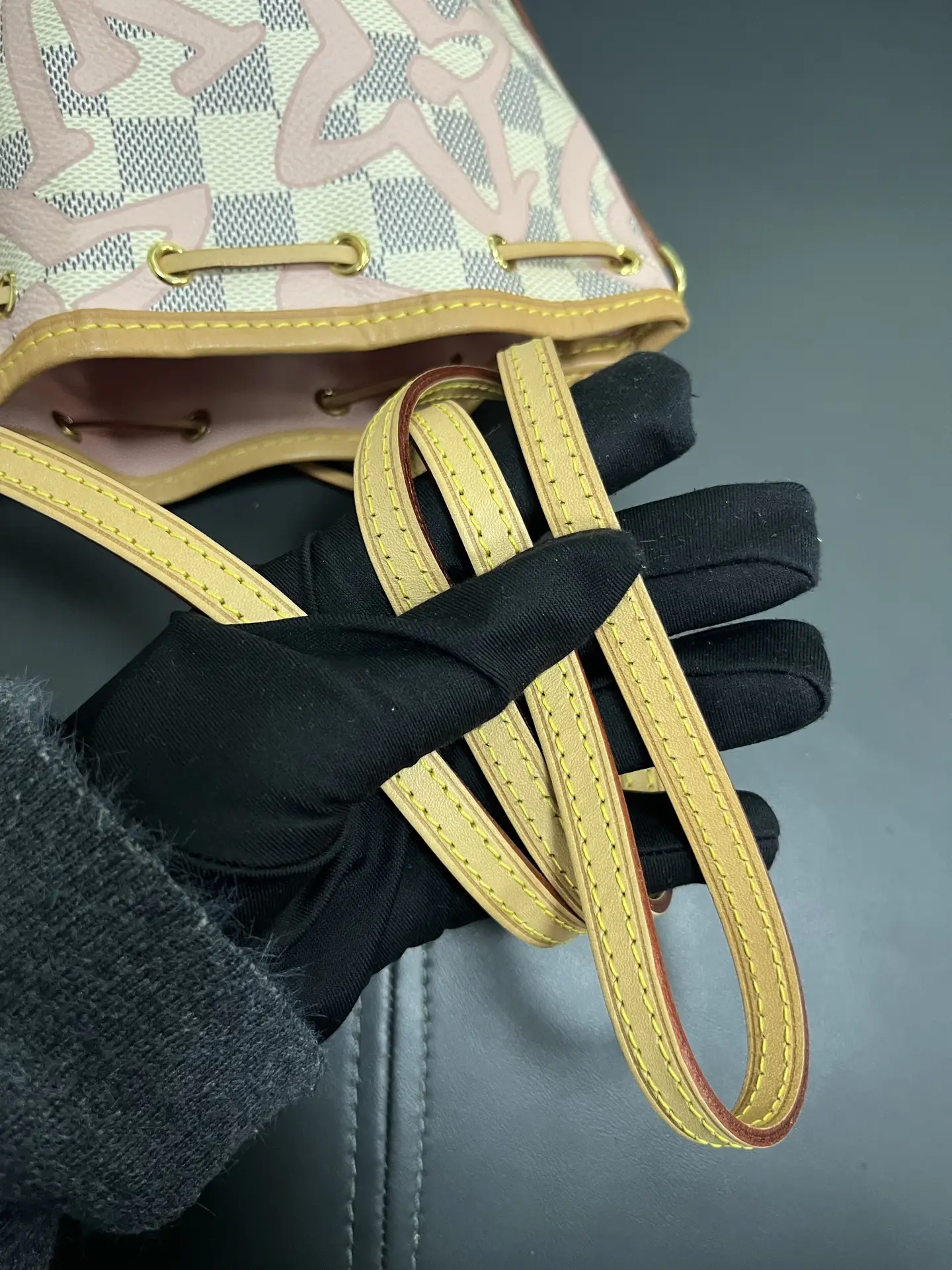 The Louis Vuitton Damier Azur Tahitienne Nano Noé bag in Rose Ballerine is a whimsical and limited seasonal piece, combining the classic checkerboard canvas with tropical floral prints and a delicate pink lining, reimagining the iconic bucket silhouette in a playful, miniature format.