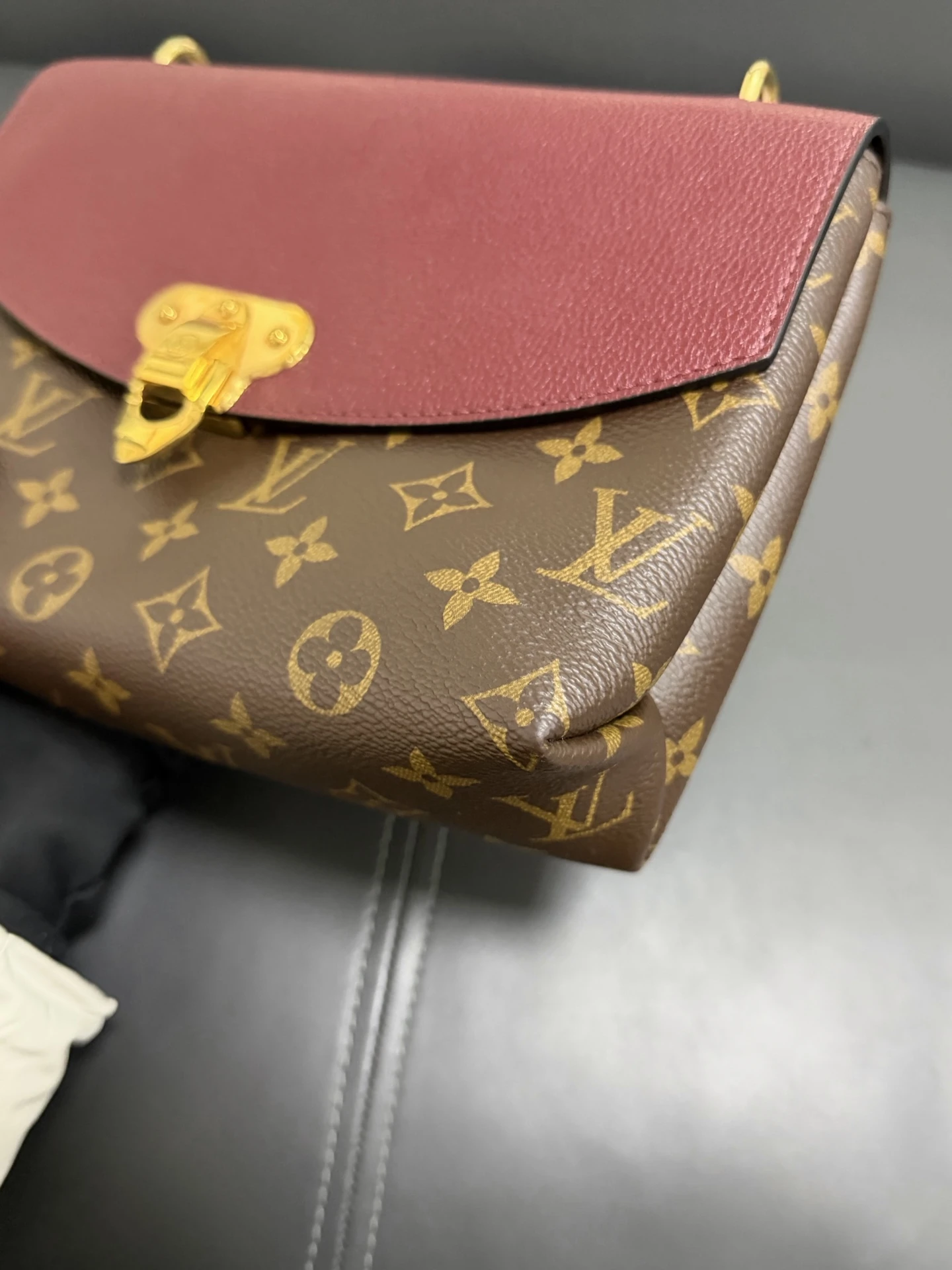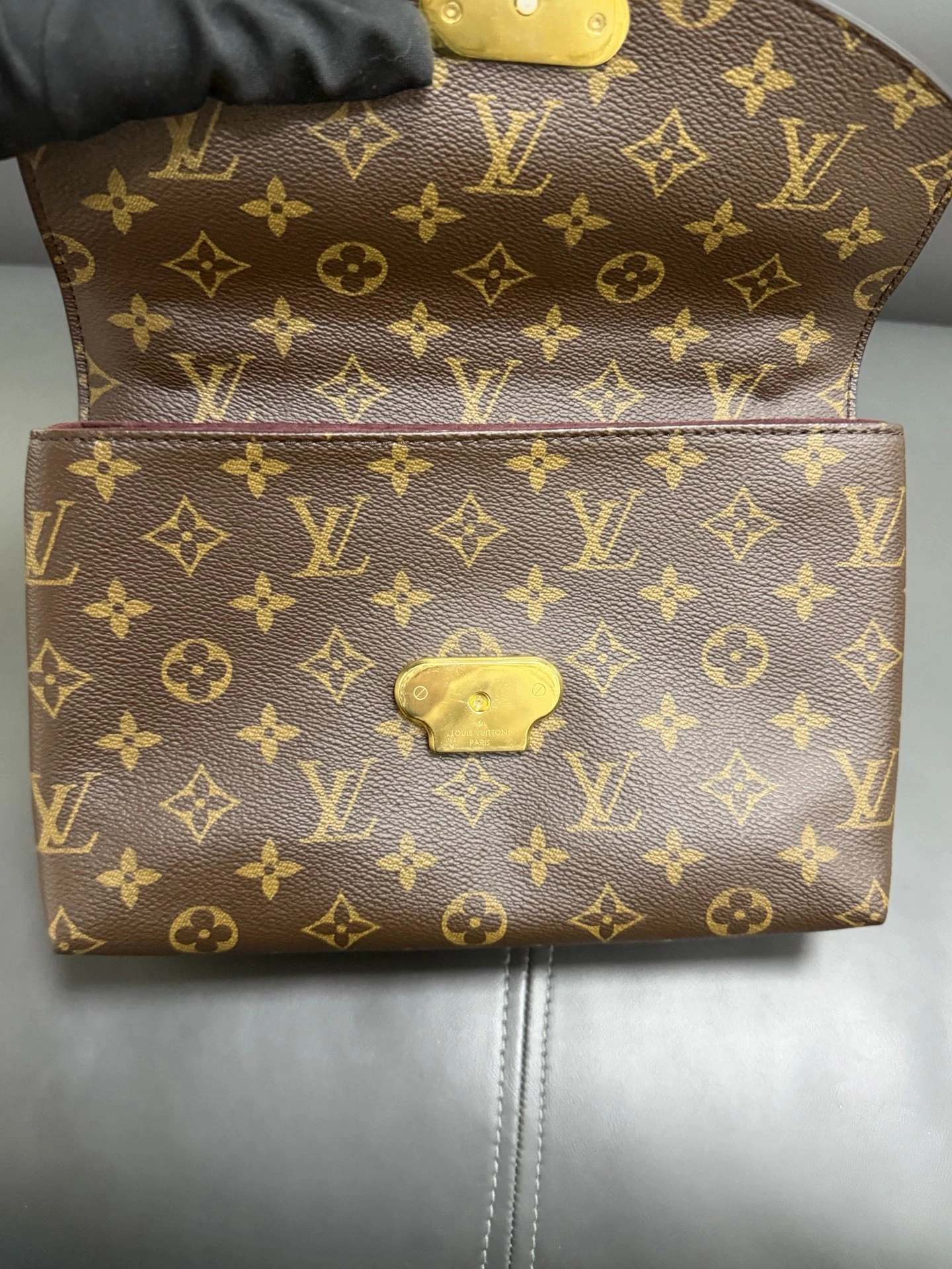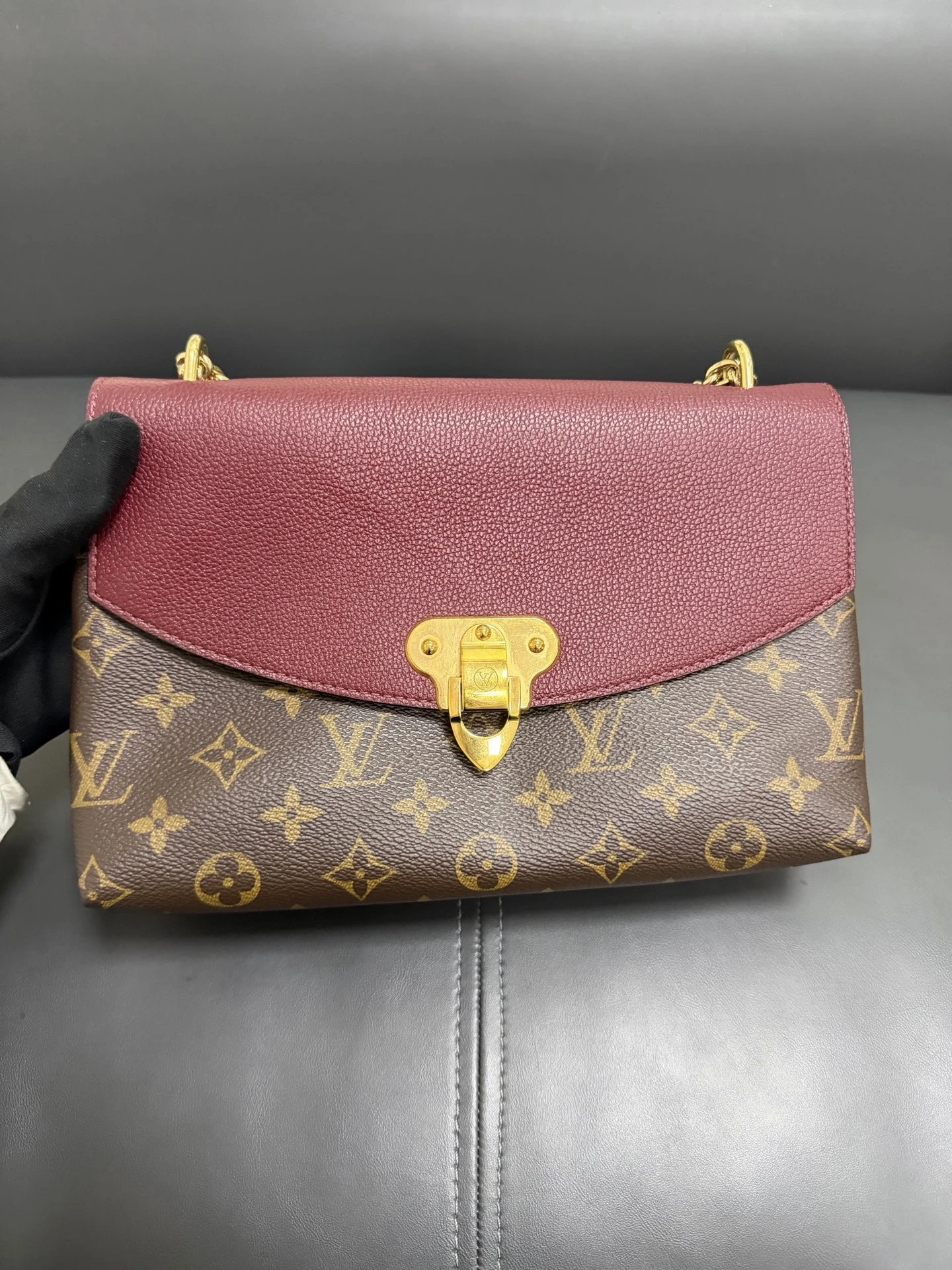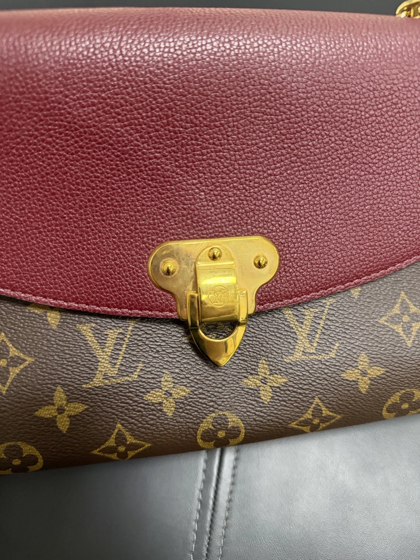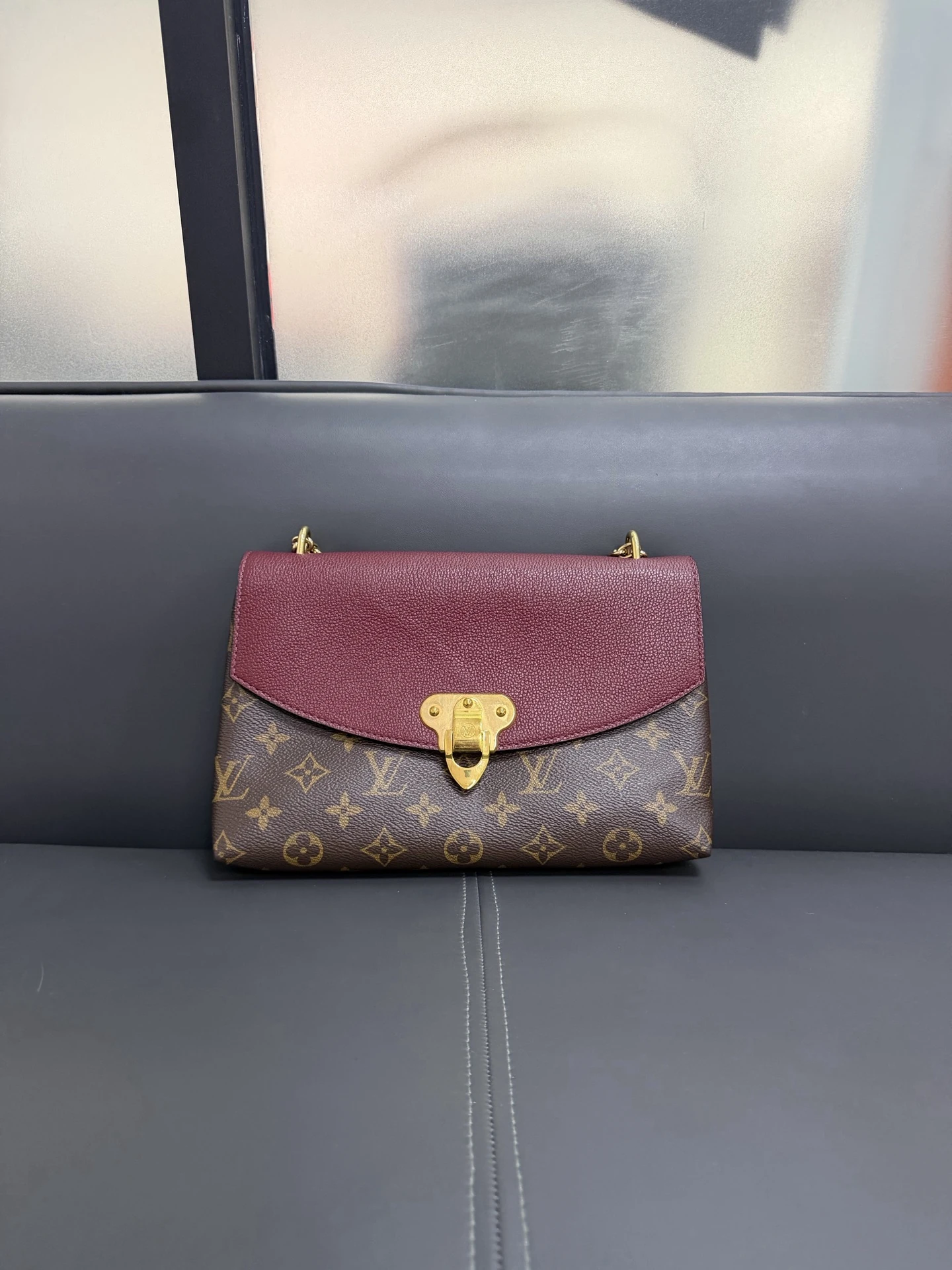 LOUIS VUITTON Saint Placide Monogram Canvas Burgundy Leather is a chic envelope-style bag combining iconic monogram canvas with rich burgundy leather. Elegant yet practical, perfect for everyday and evening use.