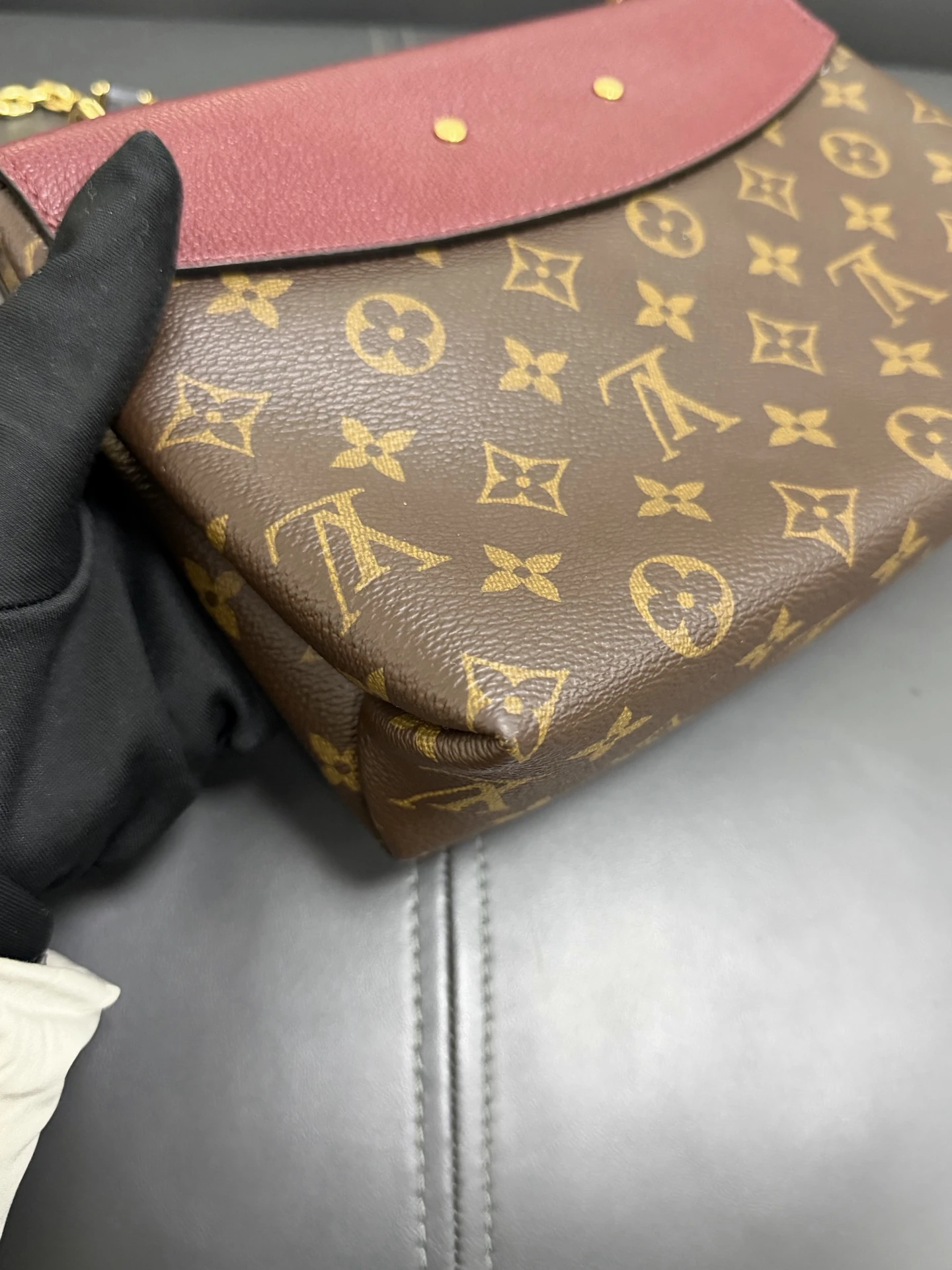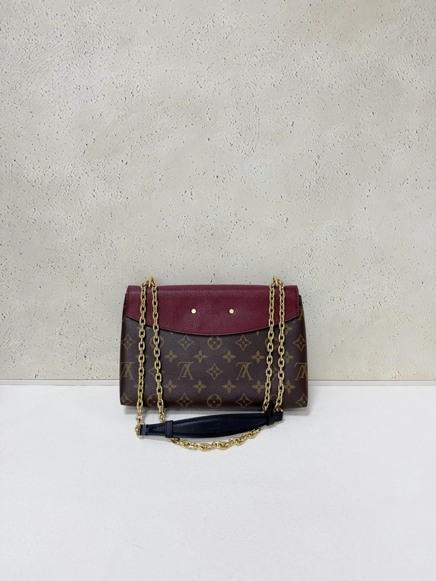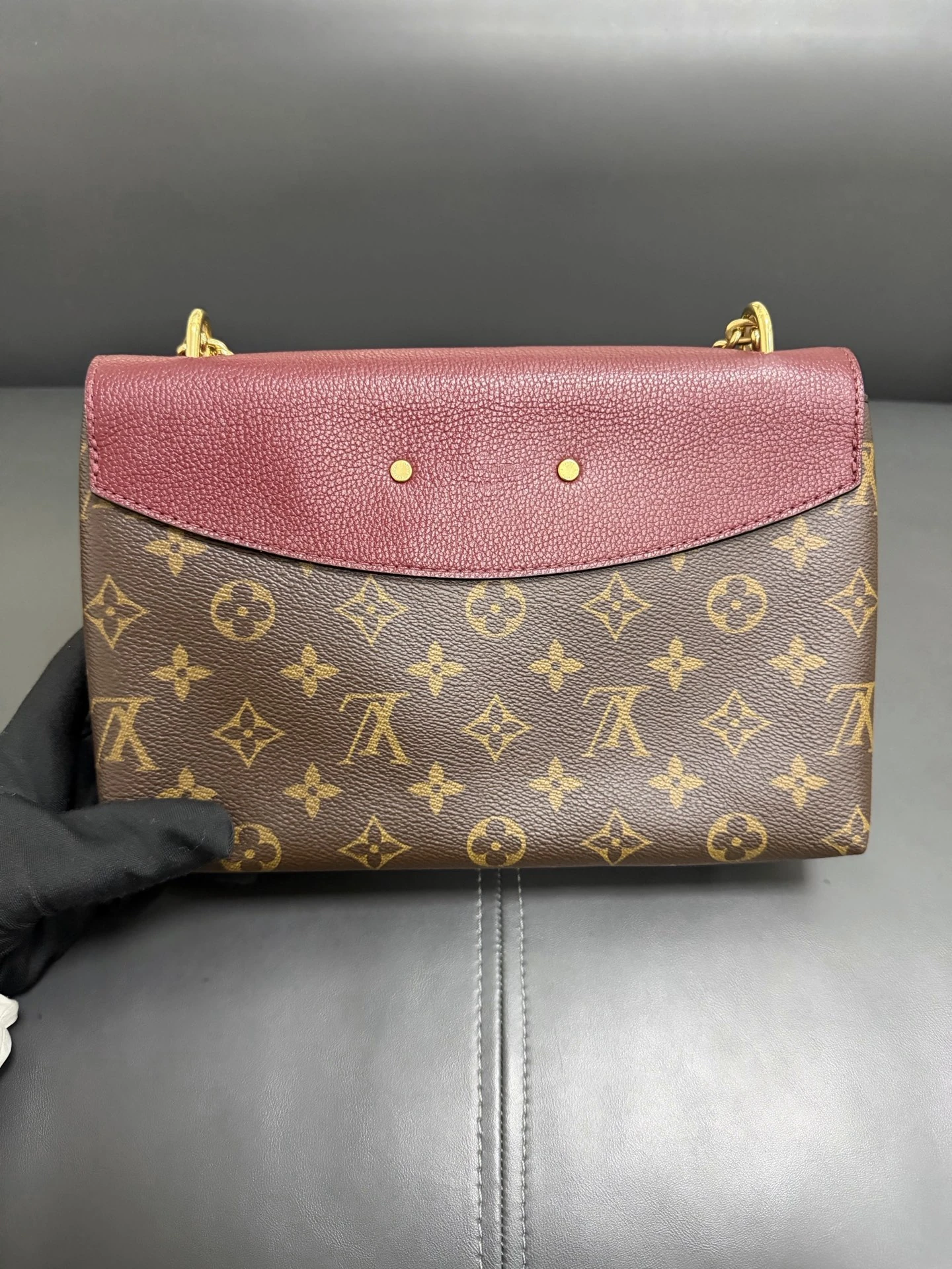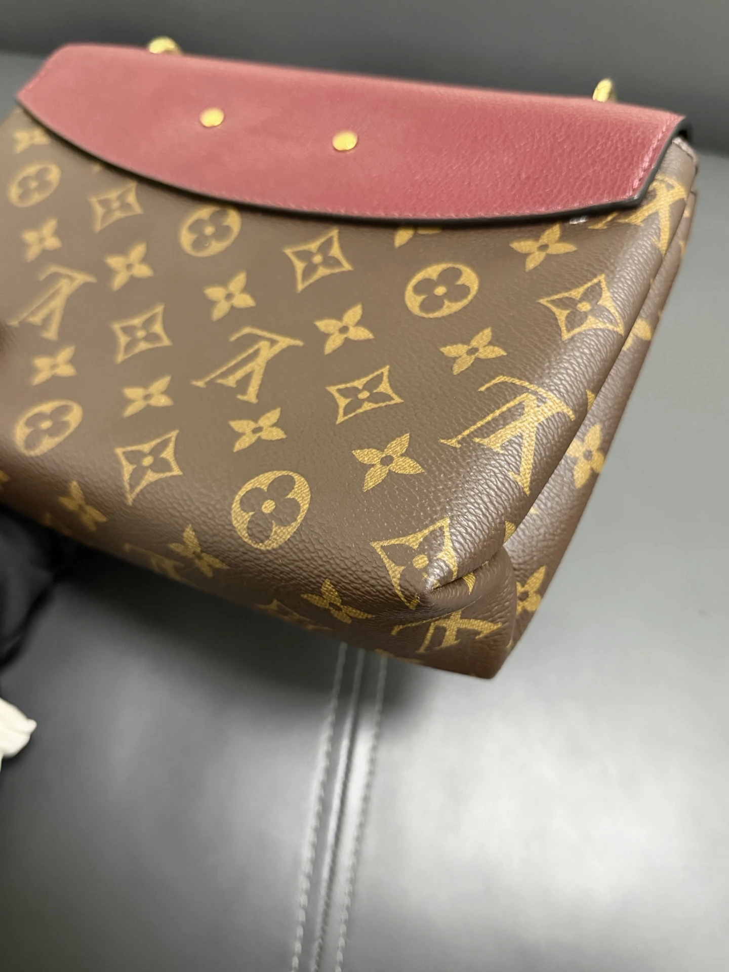 LOUIS VUITTON Saint Placide Monogram Canvas Burgundy Leather is a chic envelope-style bag combining iconic monogram canvas with rich burgundy leather. Elegant yet practical, perfect for everyday and evening use.