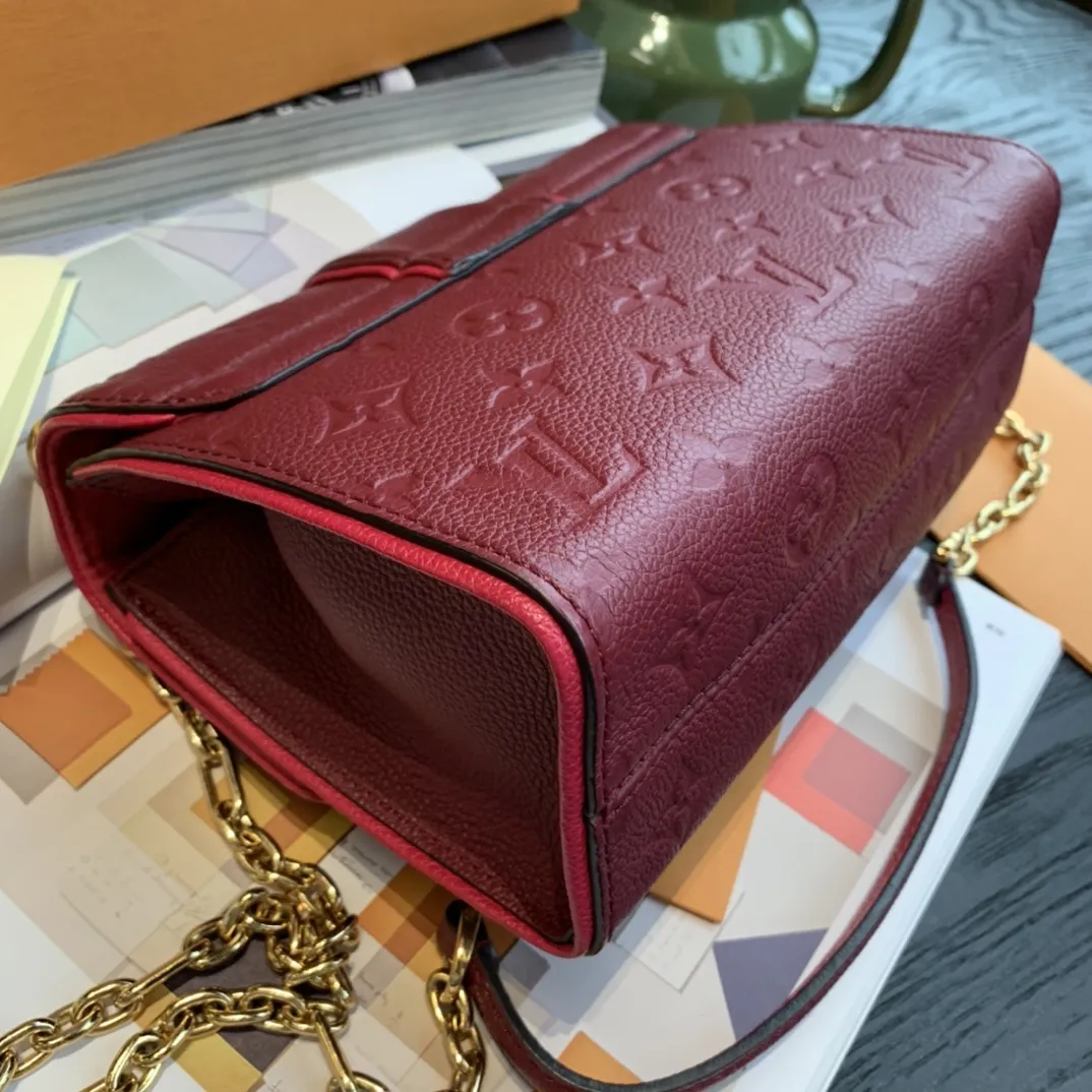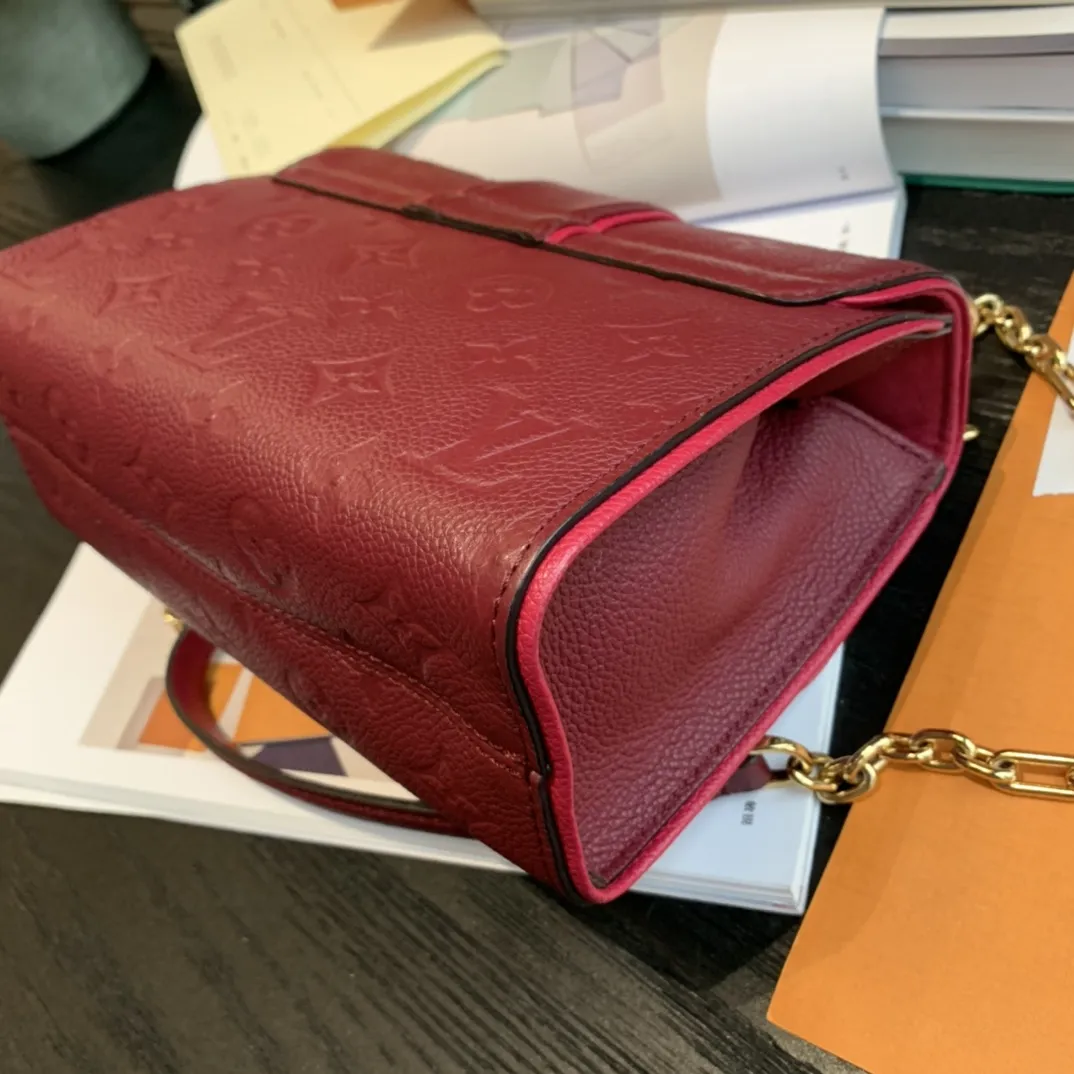 LOUIS VUITTON Saint Sulpice BB Bag In Red,this 2018 Saint Sulpice BB crossbody bag features a monogram empreinte leather body, a chain link strap with a leather guard, and a top flap with an S-lock closure. It also features an interior slip pocket.